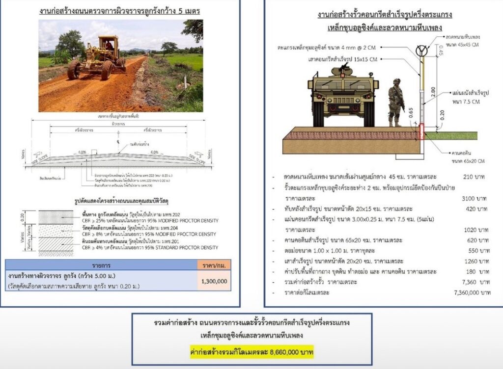 • ส่วนรั้วชายแดน 7,360,000 บาทต่อกิโลเมตร (หรือ 7,360 บาทต่อเมตร)