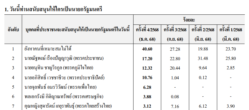 ที่มา : นิด้าโพล : “การสำรวจคะแนนนิยมทางการเมืองรายไตรมาส ครั้งที่ 1 – 4 /2568”