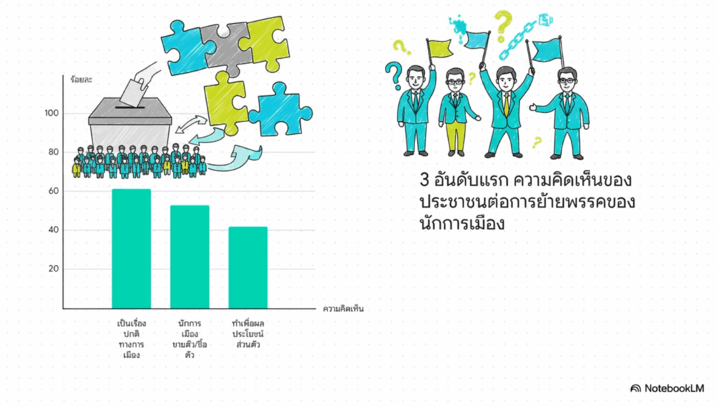 สิ่งที่น่าสนใจที่สุดคือความขัดแย้งในมุมมองของประชาชน ประชาชนส่วนใหญ่ถึง 61.32% มองว่าการย้ายพรรคเป็น “เรื่องปกติทางการเมือง” 1 ซึ่งสะท้อนให้เห็นว่าประชาชนคุ้นชินกับปรากฏการณ์นี้จนกลายเป็นความปกติในสายตาไปแล้ว