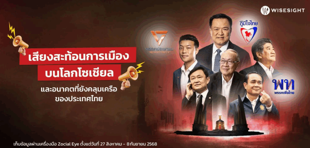 ซึ่งจากบทความ “เสียงสะท้อนการเมืองบนโลกโซเชียลและอนาคตที่ยังคลุมเครือของประเทศไทย” โดยมีที่มาจากการเก็บข้อมูลของ Wisesight หรือ บริษัท ไวซ์ไซท์ (ประเทศไทย) ตั้งแต่วันที่ 27 สิงหาคม – 8 กันยายน 2568 ด้วยเครื่องมือ Zocial Eye ได้สะท้อนให้เห็นถึงความสนใจของผู้คนต่อการเมืองไทย ดังต่อไปนี้