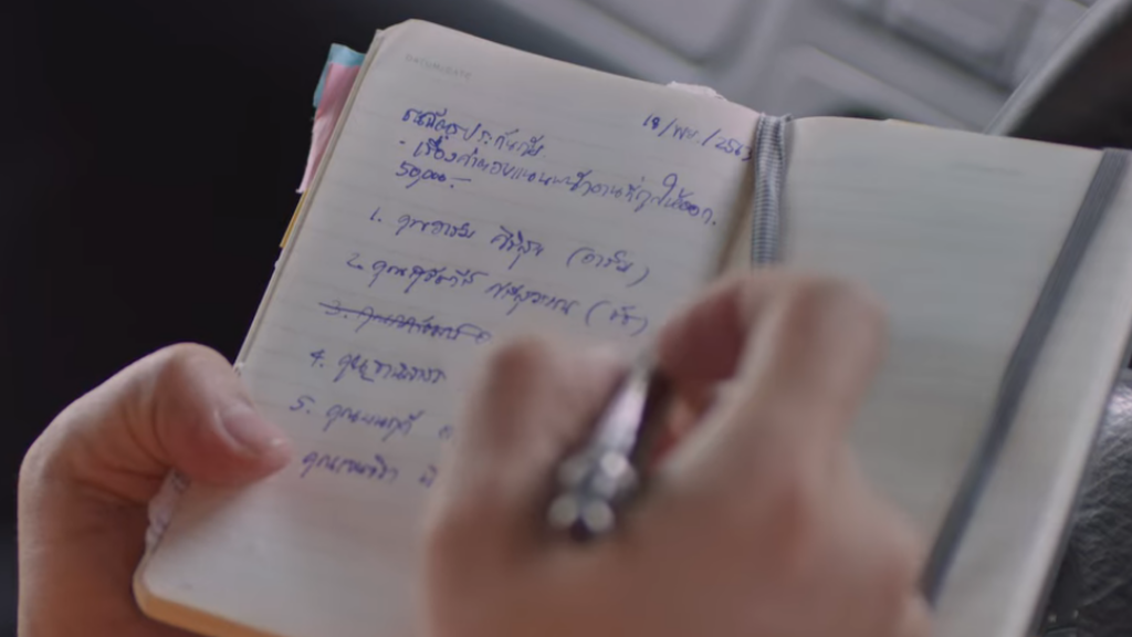‘โสฬส สุขุม’ โปรดิวเซอร์ที่มาร่วมเล่นต้นเรื่อง และใช้ชื่อเป็นประธานบริษัทในประกาศนียบัตรพนักงานดีเด่นที่ตุ้มเคยได้รับ – ภาพจาก Netflix