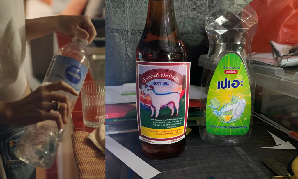 – มีผลิตภัณฑ์ในเรื่อง 4 ยี่ห้อ ที่ไม่มีอยู่บนโลกจริง ประกอบไปด้วย ‘ธนฉัตร ประกันภัย’ บริษัทประกันภัยที่ตุ้มทำงานอยู่, ‘น้ำปลาตราแพะ’ เครื่องปรุงเจ้าปัญหาที่ทำให้ตุ้มได้รู้จักกับจิ๋ม ล้อเลียนตรง ๆ กับ ‘ซีอิ๊วขาวตราแกะ’ ซีอิ๊วขาวตัวตึงจากตรังในตำนาน ซึ่งไม่ได้ล้อแค่ชื่อ แต่ล้อไปถึงฉลากแบบเป๊ะ ๆ, ‘กรังปรีซ์’ ยี่ห้อน้ำดื่มที่ใช้ประกอบเรื่องอยู่หลายฉาก ทั้งซีนซื้อของที่ซูเปอร์ฯ หรือฉากดื่มน้ำของตุ้ม ที่คิดชื่อใหม่ขึ้นเพราะใหม่-ดาวิกาติดสัญญาพรีเซนเตอร์น้ำดื่มอยู่ และ ‘เปเอะ’ ยี่ห้อน้ำยาล้างจานข้างซิงค์ที่ตุ้มล้างเลือดบนมีด ที่มีที่มาของชื่อจาก ‘เปเอะ ระตะนะเริง’ เฮ้ย! ‘เป็นเอก รัตนเรือง’