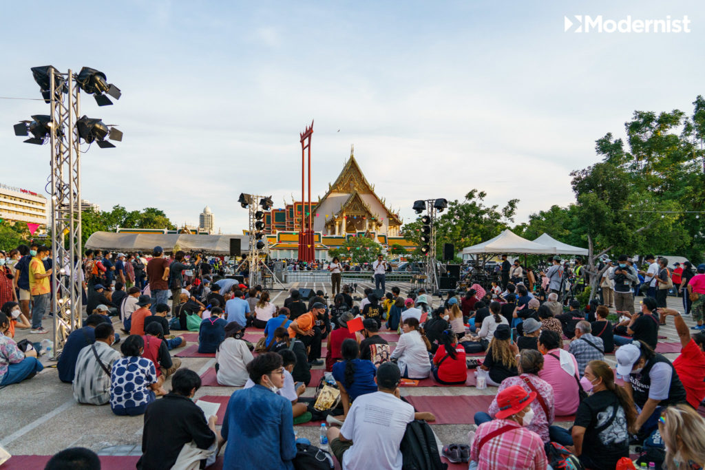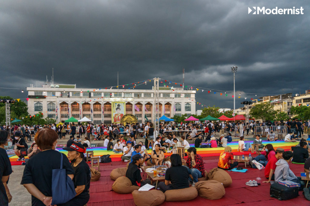 ปีนี้ต่างกับสองปีก่อนที่ผมเคยไป ตรงที่งานจัดช่วงเย็นซึ่งเป็นเวลาที่คนเริ่มเลิกงาน เราเลยเห็นคนทะยอยกันมาเรื่อย ๆ ตอนที่ขบวนเคลื่อนตัวจากอนุเสาวรีย์ประชาธิปไตยไปสู่ลานคนเมืองเรียบร้อยแล้ว