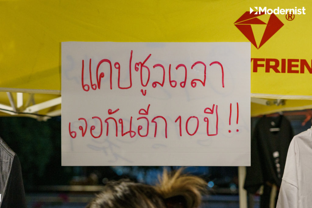 ดีที่ผมไม่ได้คิดไปคนเดียวเกี่ยวกับเรื่องอนาคตเพราะที่นี่ก็มีบูทที่ให้เราเขียนจดหมายถึงตัวเองอีกสิบปีข้างหน้า ซึ่งจดหมายที่เขียนจะถูกรวบรวมใส่ไทม์แคปซูลและฝังไว้ที่สวนครูองุ่นแล้วเปิดอีกทีก็วันที่ 24 มิถุนายน 2575 …เขาว่าอย่างนั้นนะ