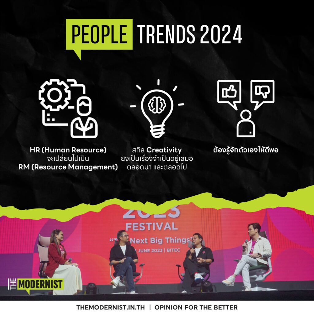 ด้วยเหตุนี้บนเวที ‘AP Thailand Presents Creative Talk Conference 2023’ จึงมี session ‘Trends 2024’ ที่แยกย่อยออกเป็น 5 แง่มุมที่แตกต่างกัน เพื่อเปิดฉากทัศน์ที่น่าสนใจในวงการสร้างสรรค์ ทั้งด้าน Creative, Marketing, Innovation, People และ Entrepreneur เพื่อทำให้ผู้คนมองไปยังอนาคตอันใกล้ได้ในเวลาเพียง 2 ชั่วโมงครึ่ง