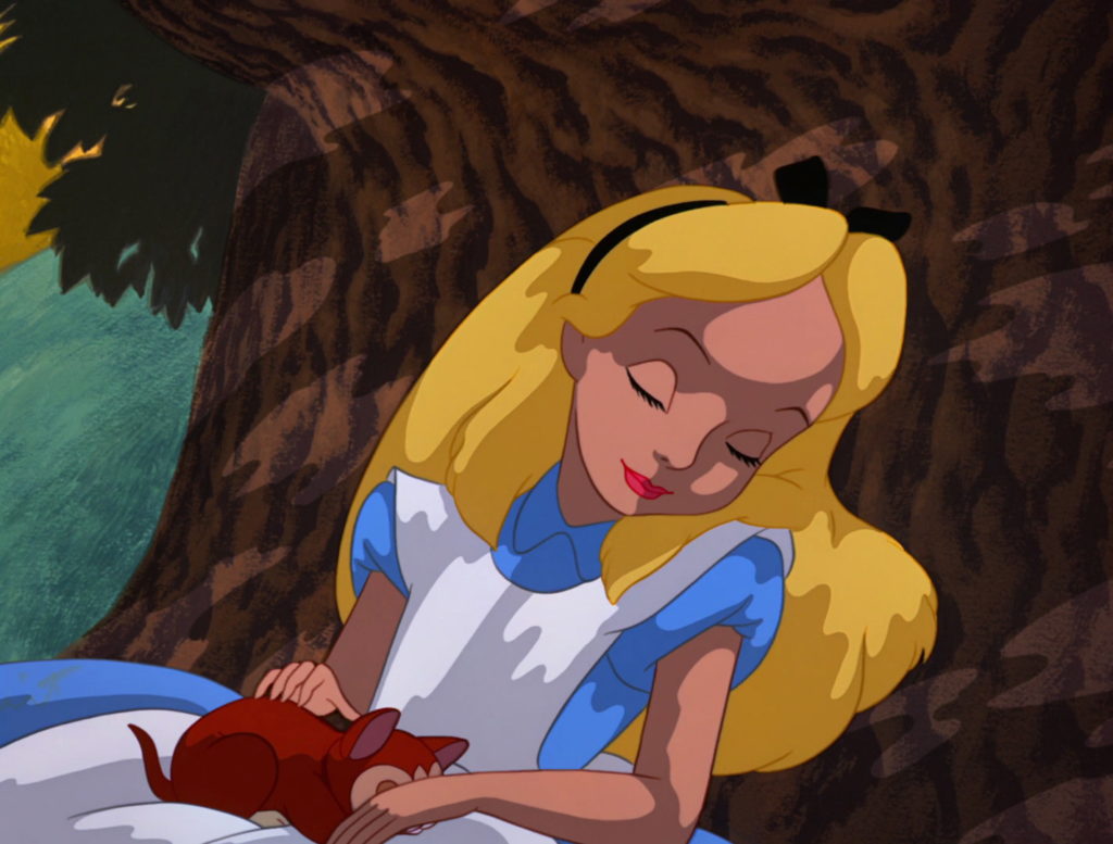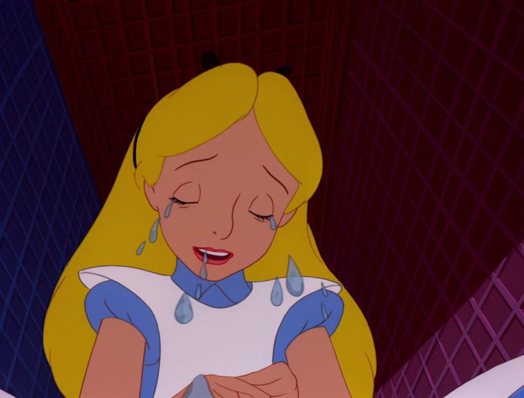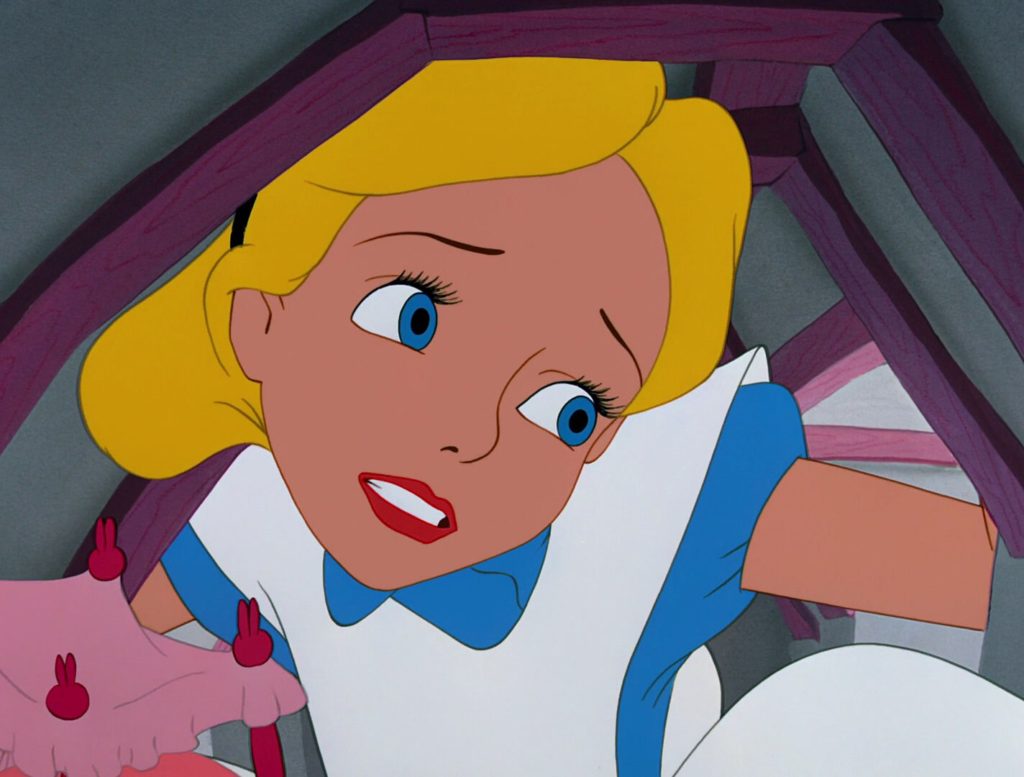 อลิซมองเห็นกระต่ายที่เร่งรีบ เธอเดินตามกระต่ายขาวตัวนั้นไป ซึ่งการ Coming of Age ของอลิซ ถูกทำให้เห็นภาพง่ายขึ้น ว่าหลังจากที่เธอตกลงไปในโพรงแล้ว ก่อนที่เธอจะออกไปเจอแดนมหัศจรรย์เพื่อหากระต่ายขาวตัวนั้น เธอต้องมีขนาดตัวที่พอดีกับประตูเสียก่อน เธอต้องกิน “น้ำย่อขนาดและเค้กเพิ่มขนาด” และเสีย “น้ำตา” ก่อนจะผ่านประตูไปได้ มันแสดงถึงการรู้ว่าทุกอย่างที่เธอคิด มันอาจจะไม่เป็นดั่งใจได้เสมอไป