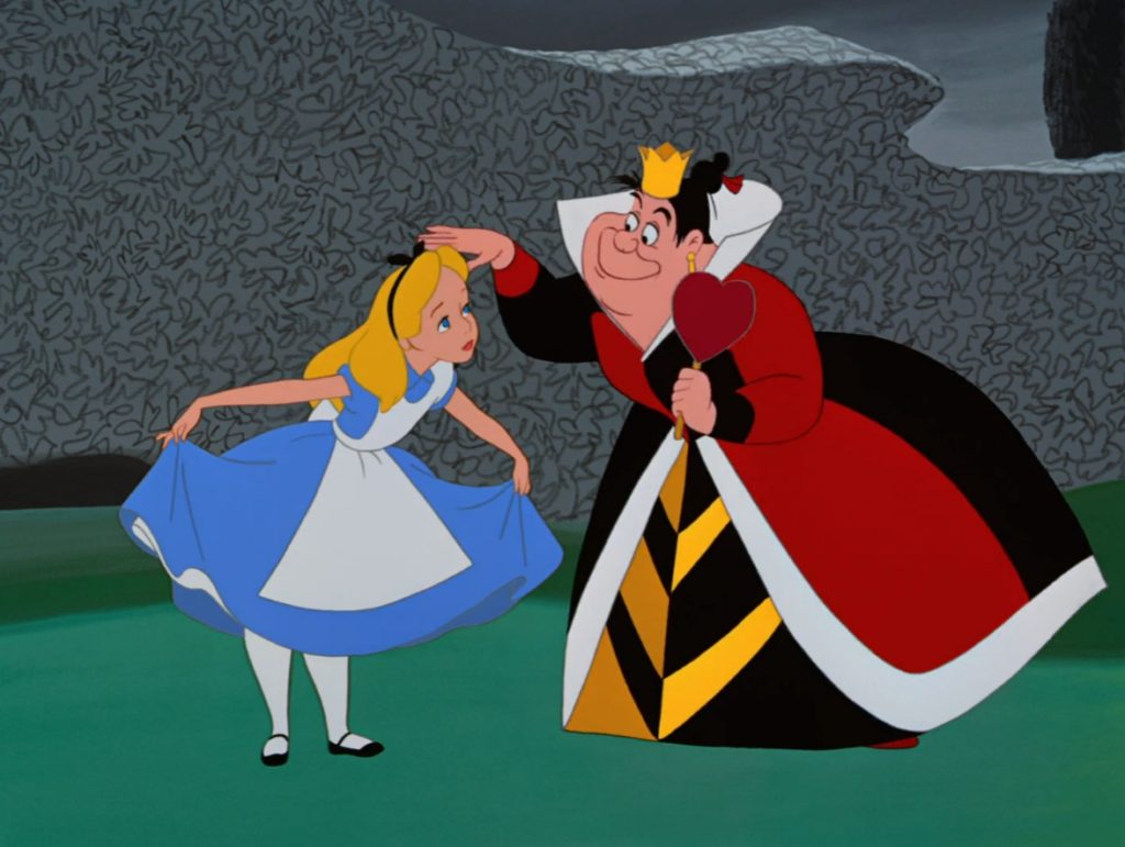 หลังจากร้องไห้หลงทางอยู่กลางป่าทัลจี้ เธอก่นด่าตัวเองในทุกๆทางว่าทำไมถึงสอดรู้ในโลกที่เธอไม่มีวันจะเข้าใจได้ เจ้าแมวเลยบอกว่า งั้นฉันมีทางลัดที่ง่ายกว่า “ระบอบกษัตริย์และเผด็จการ” ไงล่ะ ราชินีที่กุมอำนาจและเส้นทางเอาไว้ทุกอย่าง ถ้าอยากหลุดออกจากความสับสน ก็อย่าทำให้เธอโกรธ ทาสีกุหลาบให้แดงอย่างที่เธอพอใจ ไม่งั้นหัวได้หลุดออกจากบ่าแน่ๆ