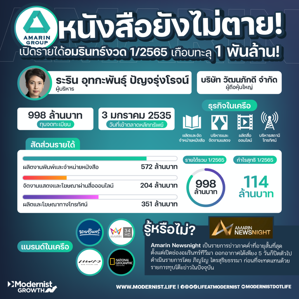 เมื่อเราพูดถึงธุรกิจสำนักพิมพ์แล้ว หลายคนคงจะคิดว่าธุรกิจนี้ได้ล้มละลายหายไปแล้ว และคนคงไม่นิยมอ่านหนังสืออีกต่อไปแล้ว แต่อันที่จริงแล้วมันไม่ได้เป็นอย่างนั้นเสียทีเดียว เพราะวันนี้ Modernist จะพาทุกคนมาทำความรู้จัก “อมรินทร์พริ้นติ้ง แอนด์ พับลิชชิ่ง” ผู้นำด้านธุรกิจสื่อแบบครบวงจร ทั้งสื่อออนไลน์ สื่อโทรทัศน์ สื่อสิ่งพิมพ์ และการจัดกิจกรรม โดยเฉพาะกับสื่อสิ่งพิมพ์ที่ครบวงจรตั้งแต่ต้นน้ำยันปลายน้ำ ทั้งการมีสำนักพิมพ์ของตนเอง โรงงานพิมพ์ และร้านจำหน่ายหนังสือ ซึ่งตัวบริษัทเขาเพิ่งประกาศรายได้ในไตรมาสที่ 1/2565 ไปเมื่อวันที่ 12 พฤษภาคม 2565 และจากการทำธุรกิจแบบนี้เขากวาดรายได้ร่วมไป 900 ล้านบาทเลยทีเดียว