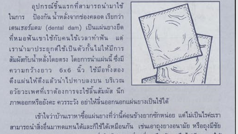 การใช้แผ่นยางอนามัย (Dental Dam หรือ Rubber Dam) หรือการตัดถุงยางอนามัยออกมาให้เป็นแผ่นสี่เหลี่ยม เพื่อใช้เป็นสำหรับออรัลเซ็กซ์ระหว่างผู้หญิงนั้น เป็นเนื้อหาที่อัญจารีสารให้ความรู้อย่างตรงไปตรงมา เรื่องการป้องกันโรคติดต่อจากเพศสัมพันธ์ระหว่างผู้หญิงกับผู้หญิง