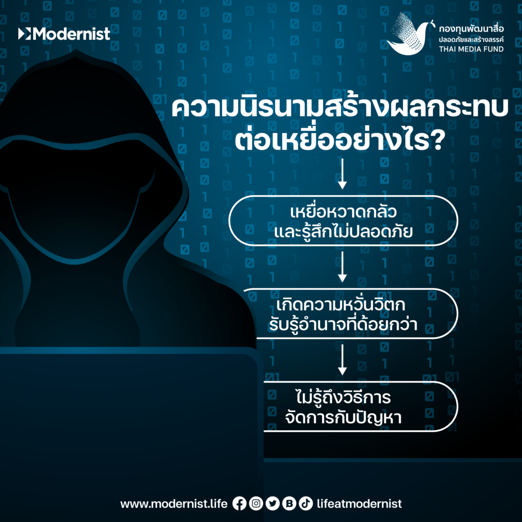 ความนิรนามส่งผลกระทบทางลบให้กับเหยื่อที่ถูกข่มเหงรังแกทางสื่ออออนไลน์ การถูก รังแกโดยบุคคลนิรนามนั้น สร้างผลกระทบทางลบให้กับเหยื่อมากกว่า เพราะสร้างความรู้สึกหวาดกลัวและไม่ปลอดภัยให้กับเหยื่อ (Christopher P. Barlett, 2015) ทำให้เกิดความหวั่นวิตก การรับรู้อำนาจที่ด้อยกว่า การไม่รู้ถึงวิธีการจัดการกับปัญหา (Bryce & Fraser, 2013 อ้างถึงใน อภิญญา หิรัญญะเวช, 2561)