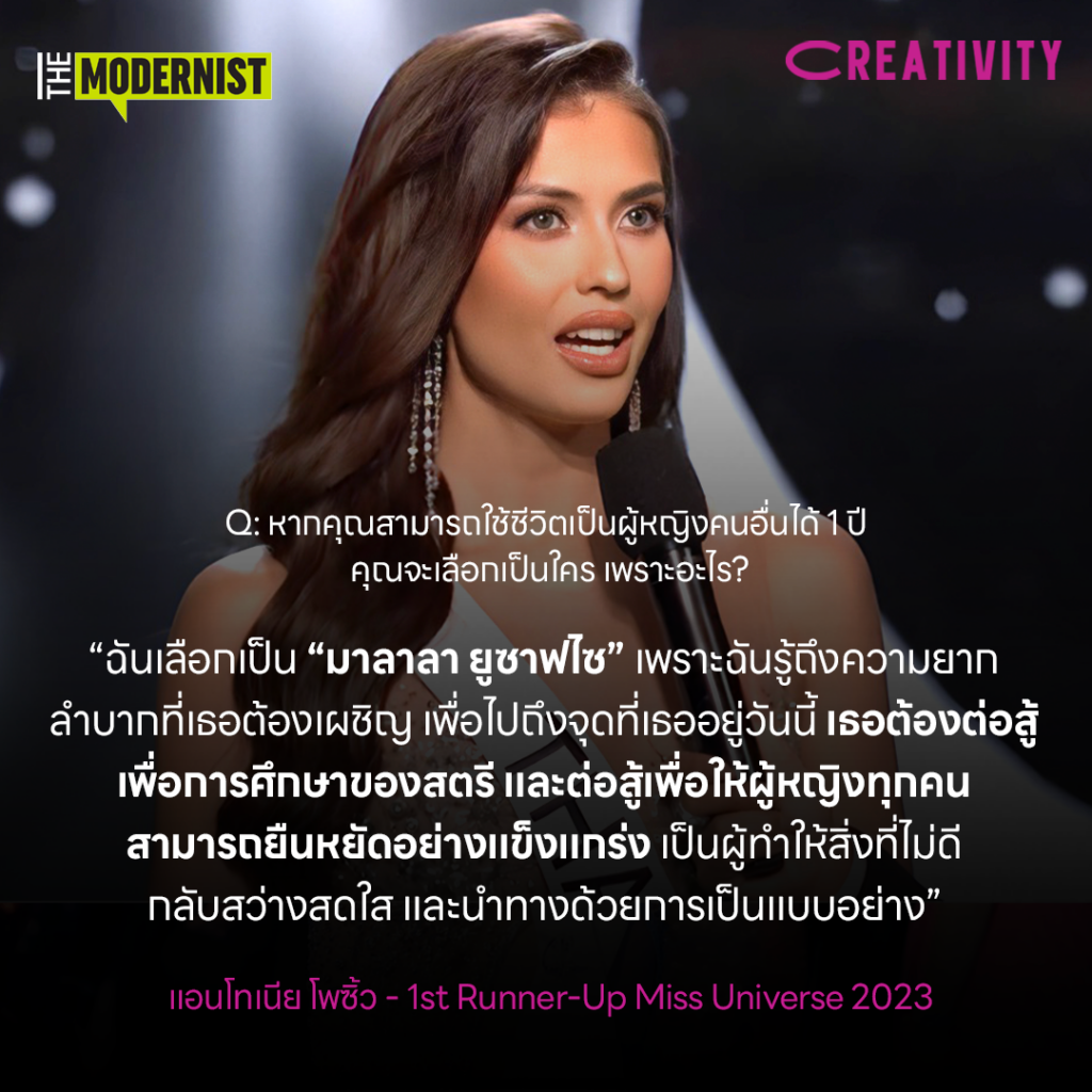 • พื้นที่เวทีนางงาม โดยเฉพาะอย่างยิ่ง MIss Universe ถือเป็นพื้นที่สำคัญหนึ่งในการ “ส่งเสียง” เพื่อชูประเด็นทางสังคมให้โลกได้ประจักษ์ ไม่ว่าจะผ่านชุดประจำชาติ หรือการตอบคำถาม ยิ่งรอบลึกเท่าไหร่ ยิ่ง Impact