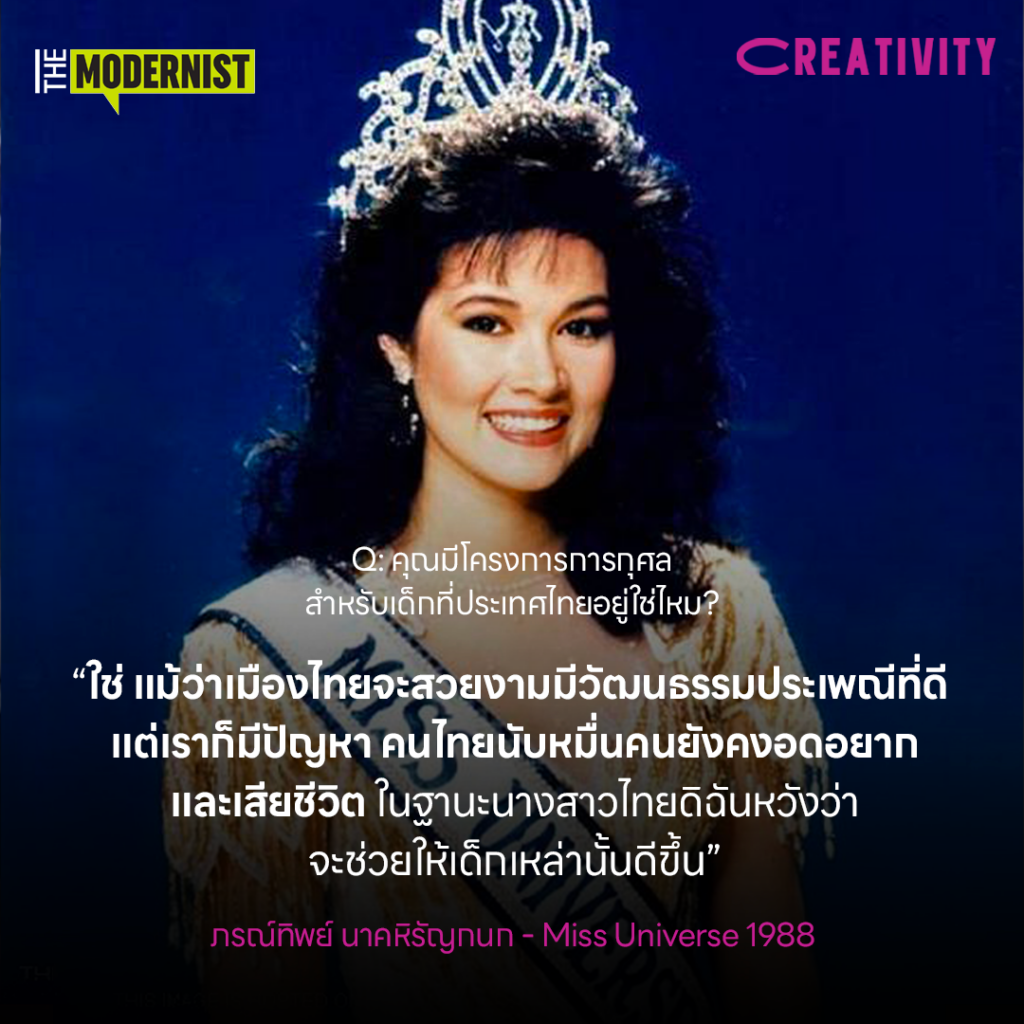 “ใช่ แม้ว่าเมืองไทยจะสวยงาม มีวัฒนธรรมประเพณีที่ดี แต่เราก็มีปัญหา คนไทยนับหมื่นคนยังคงอดอยากและเสียชีวิต ในฐานะนางสาวไทยดิฉันหวังว่า จะช่วยให้เด็กเหล่านั้นดีขึ้น”