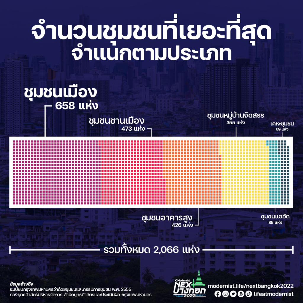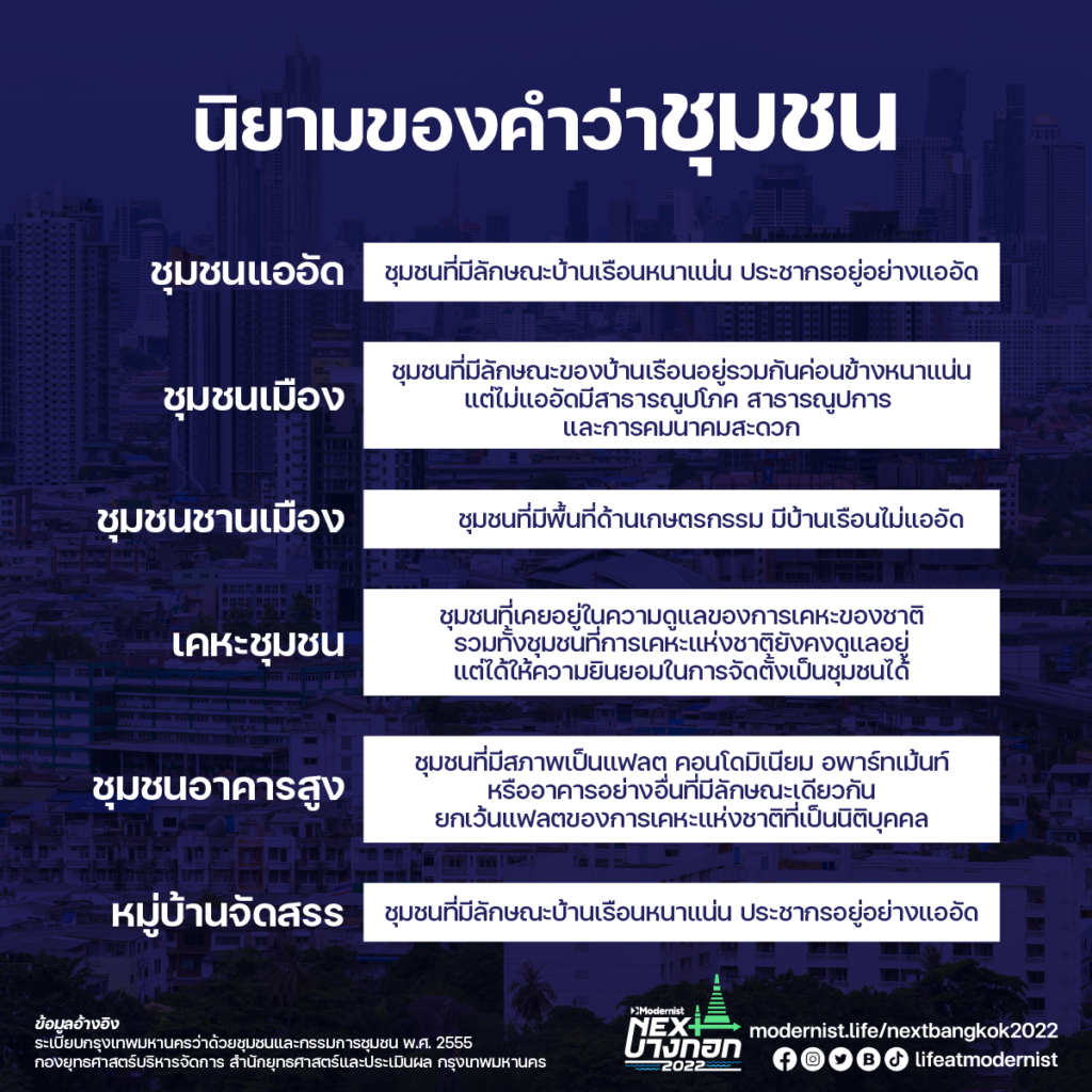 ข้อมูลจากกองยุทธศาสตร์บริหารจัดการ สำนักยุทธศาสตร์และประเมินผล กรุงเทพมหานคร เมื่อวันที่ 18 พฤศจิกายน 2564 ได้สำรวจพื้นที่ชุมชนในแต่ละเขตในพื้นที่กรุงเทพมหานครเอง พบว่าเรามีชุมชนรวมกันถึง 2,066 แห่ง! และมีการจำแนกชุมชนออกมาเป็นจำนวน 6 นิยามด้วยกัน แล้ว 6 นิยามนี้จะนิยามตัวตนว่าอย่างไรกันบ้าง? วันนี้ Modernist ในแคมเปญ “Modernist Next บางกอก 2022” จะพาพวกคุณทุกคนมาทำความรู้จักว่าแต่ละพื้นที่มีชุมชนแบบไหนมากที่สุดกัน?