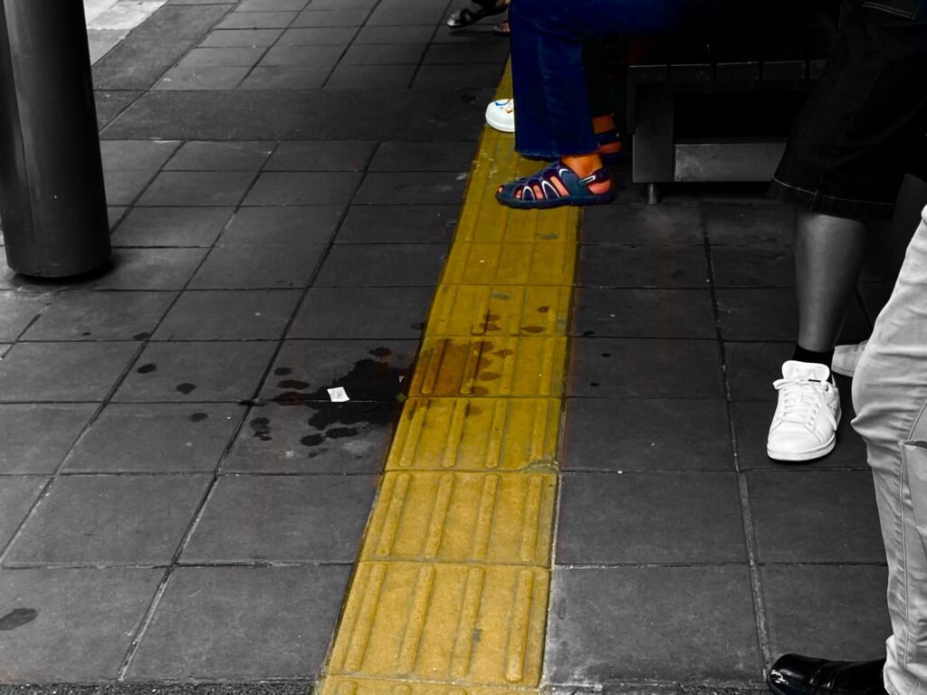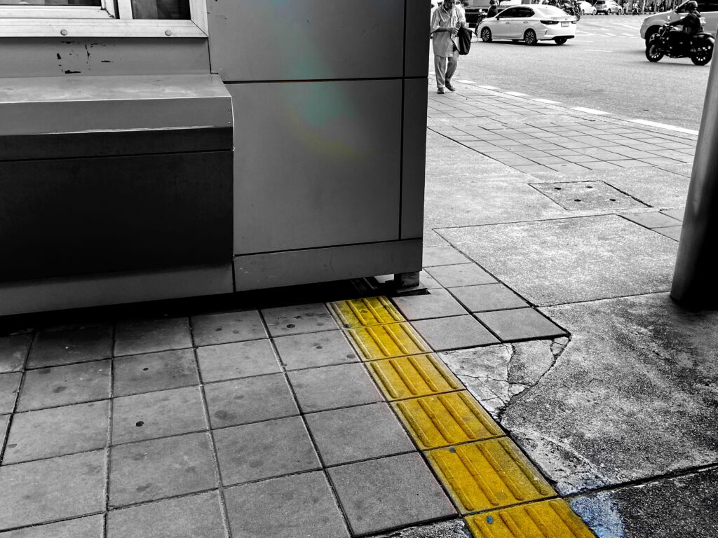 เดินมาอีกหน่อยก็เจอกับเบรลล์บล็อกที่บอกมาตลอดทาง แต่เมื่อมาถึงจุดหนึ่งก็สิ้นสุด! หมดหนทางไปต่อ แล้วแบบนี้คนตาบอดจะเดินต่อยังไงล่ะ นอกจากค่อยๆ คลำทางต่อไป บางจุดก็ดันมีคนวางของขวางไว้ หรือติดตั้งชิดที่นั่งรอรถประจำทางเกินไป