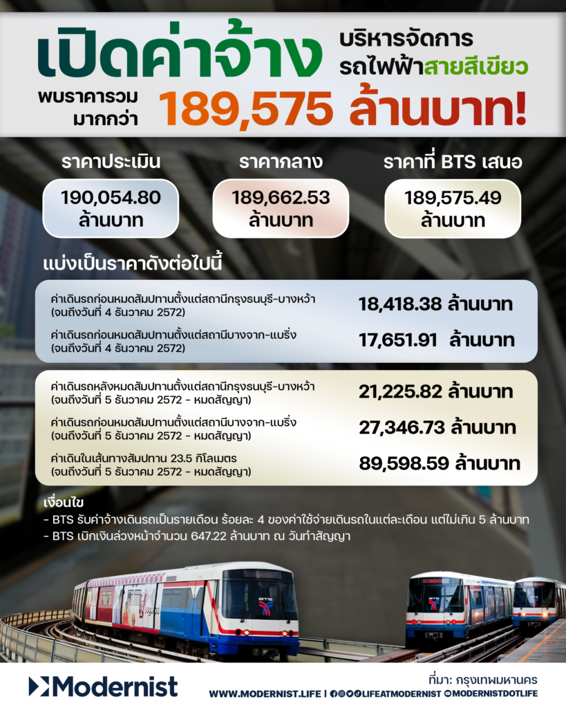 หลังจากที่คราวก่อน Modernist ได้นำเสนอเรื่องราวการเปิดบันทึกข้อตกลงมอบหมายให้บริษัท กรุงเทพธนาคม จำกัด เป็นผู้บริหารจัดการเดินรถโครงการระบบขนส่งมวลชนสายสีเขียว ช่วงหมอชิต – สะพานใหม่ – คูคต และช่วงแบริ่ง – สมุทรปราการ ไปเป็นที่เรียบร้อยแล้วนั้น หลายท่านอาจจะกำลังสงสัยเกี่ยวกับจำนวนตัวเลขที่ชัดเจนในการเปิดเผยข้อมูลการเดินรถไฟฟ้าสายสีเขียวว่าทั้งหมดมีค่าใช้จ่ายเท่าไหร่บ้าง? และเช่นเคย วันนี้เราจะมาเปิดดูข้อมูลด้านนี้ให้ลึกขึ้นผ่านตัวเลขกัน
