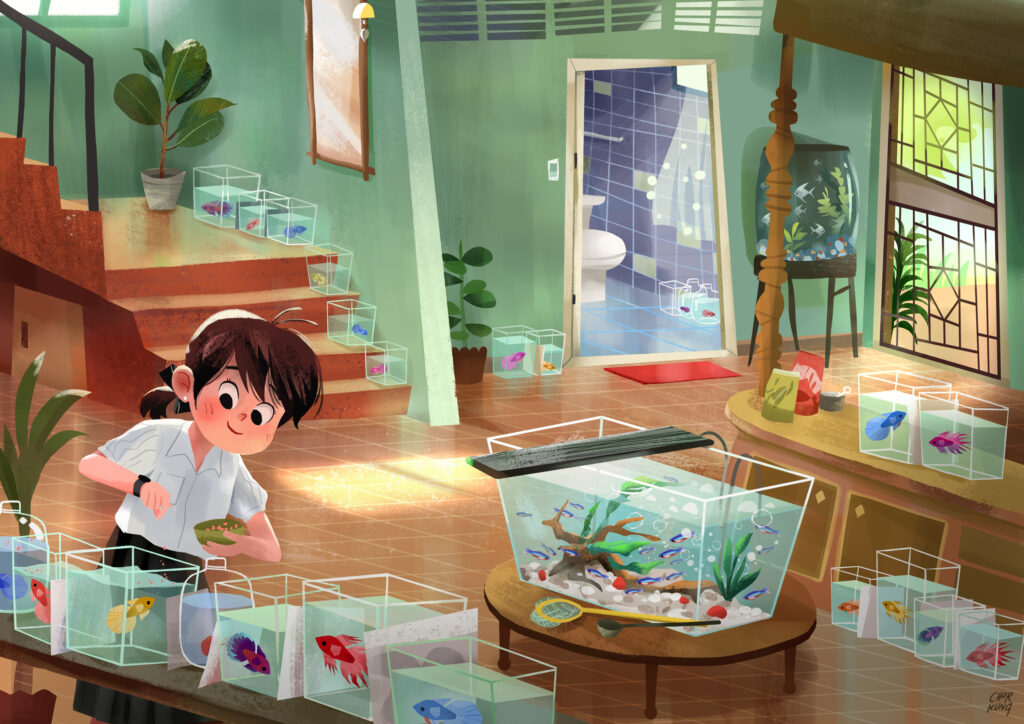 คุณกุงเล่าให้ฟังว่าตัวเธอนั้นป็นเด็กที่ชื่นชอบการ์ตูนมาก จุดเริ่มต้นแรกของเธอในฐานะนักวาดคือการเริ่มวาดสิ่งที่ตัวเองชอบไปเรื่อยๆ อย่างสม่ำเสมอ แม้ช่วงหัวเลี้ยวหัวต่อของชีวิตในช่วงวัยมัธยมจะตัดสินใจเลือกเรียนสายวิทย์เพราะยังไม่แน่ใจว่าตัวเองต้องการอะไร แต่เมื่อค้นเจอคำตอบของคำถามในใจ คุณกุงจึงเบนเข็มไปสายศิลป์ ด้วยเหตุผลว่านี่เป็นสิ่งที่ชอบ โชคดีที่ทางครอบครัวสนับสนุนให้เธอได้เลือกเดินบนเส้นทางที่เธอต้องการโดยไม่ได้ห้ามปรามอะไร