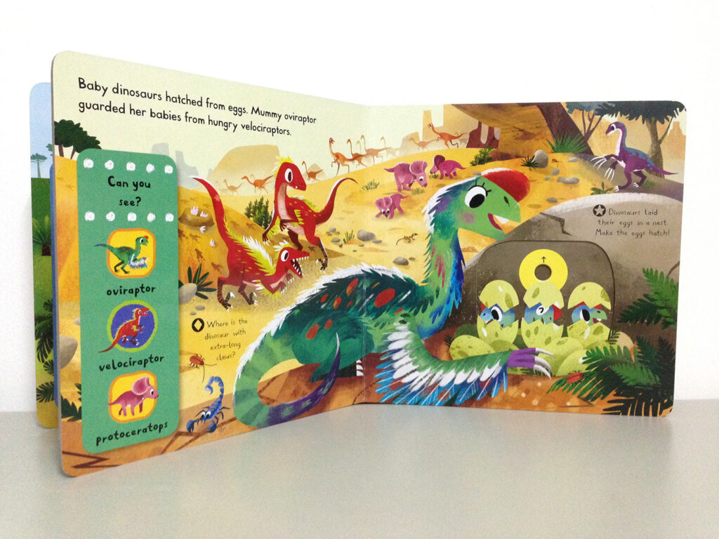 “หลังจากได้บรีฟมา เราก็จะสเก็ตช์ภาพร่างให้ทางบก. ไป ก็คือจัดองค์ประกอบภาพไปให้ดูก่อนแบบไม่ละเอียดมาก ติดชื่อว่าไดโนเสาร์ตัวนี้ชื่อนี้กำลังทำอันนี้ๆ นะ แล้วถ้าเกิดผ่าน ทางบก. เขาก็จะขอดูแบบละเอียดขึ้น คือเราก็จะมี Draft Sketch แล้วก็ Color Sketch เพื่อให้เขาดูอีกทีว่าสีในภาพโทนมันจะประมาณนี้นะ ถ้าเขาโอเคก็ถึงจะค่อยเก็บรายละเอียด แต่ถ้าเป็นหนังสือนิทาน (Fiction) ตัวอย่างเช่น ‘ฮีโร่จ๋อ’ ที่ทำกับสำนักพิมพ์ห้องเรียน อันนี้ก็จะฟรีหน่อย ต้นไม้เป็นยังไงก็ได้ สีอะไรก็ได้ สัตว์เดินสองขาก็ได้ สำนักพิมพ์ก็จะให้อิสระเราเยอะขึ้นว่าเราจะดีไซน์หรือจะวาดยังไง มันเป็นการทำงานแบบต้องคอยอัพเดตกับกองบรรณาธิการเรื่อยๆ นะ ส่งไปส่งกลับ ไม่ใช่ว่าทำเสร็จหมดแล้วไฟนอลเลย แล้วค่อยมาแก้ไม่ใช่แบบนั้น มันใช้เวลา”
