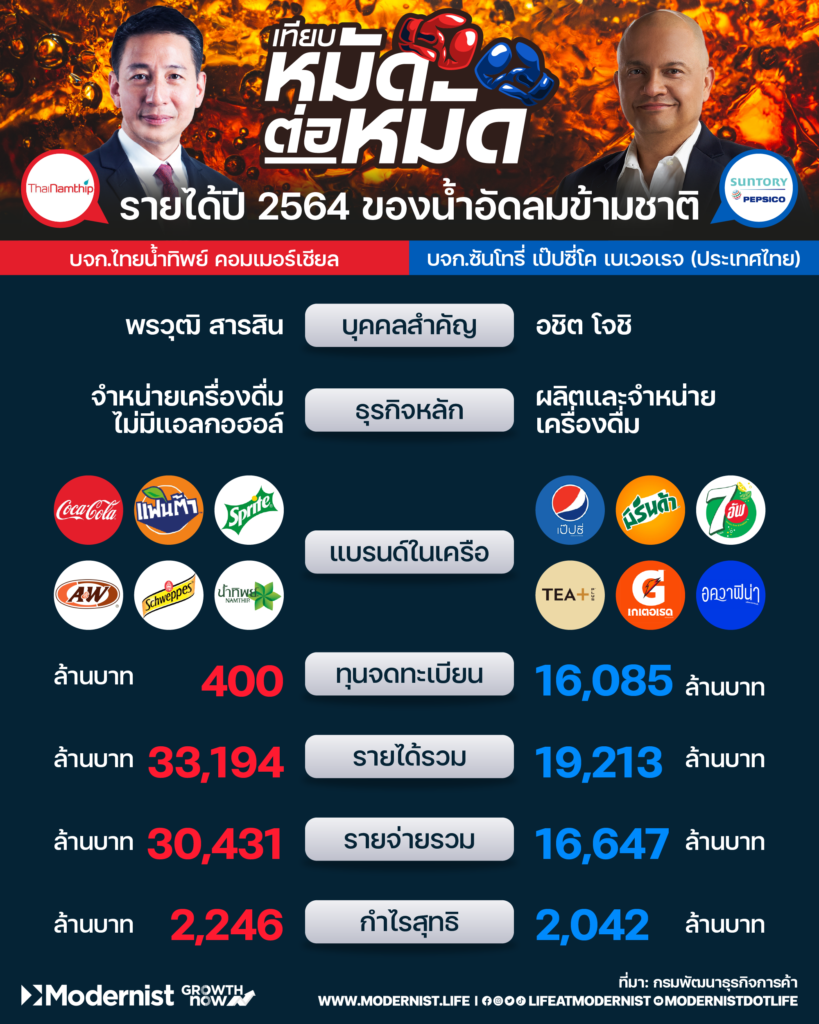 ในส่วนของเป๊ปซี่ ซึ่งบริหารงานโดยบริษัท ซันโทรี่ เป๊ปซี่โค เบเวอเรจ (ประเทศไทย) จำกัด และมีแบรนด์ในเครือค่อนข้างหลากหลาย โดยเฉพาะการเข้ามาของซันโทรี่ ทำให้มีแบรนด์สัญชาติญี่ปุ่นเข้ามาจำนวนหนึ่งเลยทีเดียว ซึ่งบริษัทนี้จะดูแลด้านเครื่องดื่มทั้งหมดในเครือเป๊ปซี่ และเครือซันโทรี่ โดยมีหัวเรือใหญ่อย่าง อชิต โจชิ เป็นผู้บริหาร มีทุนจดทะเบียนบริษัท 16,085 ล้านบาท ซึ่งในปี 2564 ในส่วนของบริษัทนี้มีรายได้รวมถึง 19,213 ล้านบาท และมีรายจ่ายรวม 16,647 ล้านบาท ทำให้มีผลกำไรสุทธิรวม 2,042 ล้านบาท