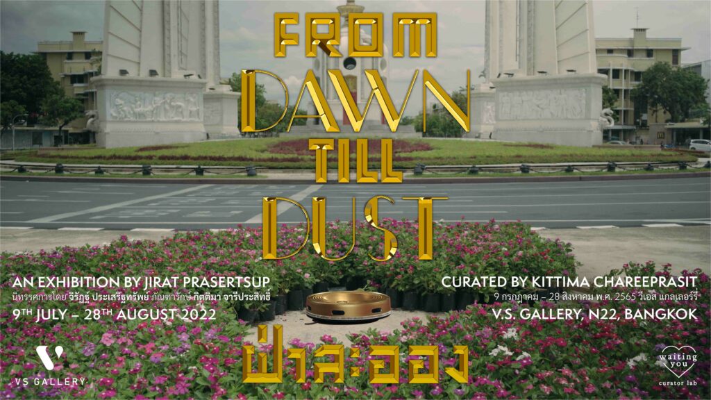 ฝ่าละออง หรือ From Dawn Till Dust งานศิลปะจัดวางชิ้นที่สองของจิรัฏฐ์ที่แสบไม่แพ้กัน ว่าด้วยความพยายามของชนชั้นปกครองและศักดินา ที่ต้องการจะลบ ควบคุม เปลี่ยนแปลง ประวัติศาสตร์และความทรงจำของผู้คน หรืออะไรก็ตามที่รัฐมองว่า ‘เป็นภัย’ ไม่ว่าจะเป็นหมุด ลานกว้าง สถาปัตยกรรม กระทั่งประชาชนเองก็ตาม โดยเล่าเรื่องผ่าน O-Robot หุ่นยนต์ดูดฝุ่น ที่ตั้งหน้าตั้งตาทำงานของตัวอย่างขยันขันแข็ง