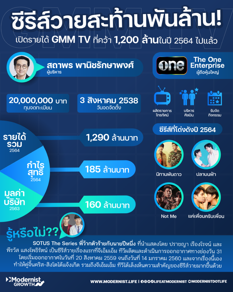 หากเราพูดถึงบริษัทที่บุกเบิกอุตสาหกรรมการผลิตซีรีส์วาย หรือซีรีส์แนวประเภทชายรักชายที่ปัจจุบันหลายบริษัทได้ผลิตกับเป็นล่ำเป็นสันแล้ว จะพบชื่อของจีเอ็มเอ็ม ทีวี เป็นชื่อแรกๆ ในเจ้าที่บุกเบิกทำซีรีส์วาย และด้วยคุณภาพของเนื้อหาที่ตรงใจของผู้ชม ทำให้คอนเทนต์ของจีเอ็มเอ็ม ทีวีได้รับผลตอบรับที่ดีมากขึ้นเรื่อย ๆ และยังสามารถต่อยอดเป็นกิจกรรมต่างๆ ได้อีกมากมายอีกด้วย วันนี้ Modernist จะพาทุกคนมาเข้าใจจีเอ็มเอ็ม ทีวีให้มากขึ้นกัน