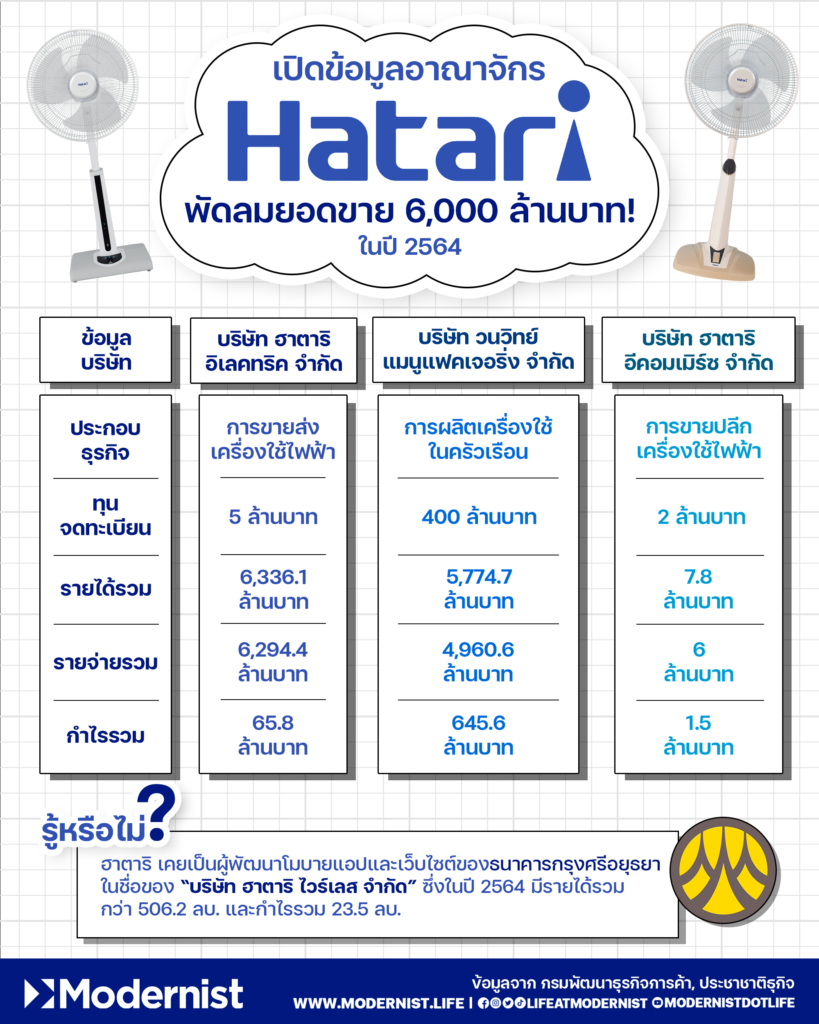 หากจะกล่าวถึงพัดลมที่คนไทยชื่นชอบและมีติดบ้านไว้อยู่ คงจะต้องมีชื่อ “ฮาตาริ” อย่างแน่นอน และอีกเช่นกัน หลายคนคงทราบว่าพัดลมฮาตารินั้นเป็นของคนไทย ที่พัฒนาพัดลมออกมาจนประสบความสำเร็จและเข้าสู่ตลาดเครื่องใช้ไฟฟ้าได้อย่างภาคภูมิใจ วันนี้ Modernist ขอพาทุกคนมาบุกอาณาจักรฮาตาริว่าในปี 2564 มีรายได้เท่าไหร่กันบ้าง?