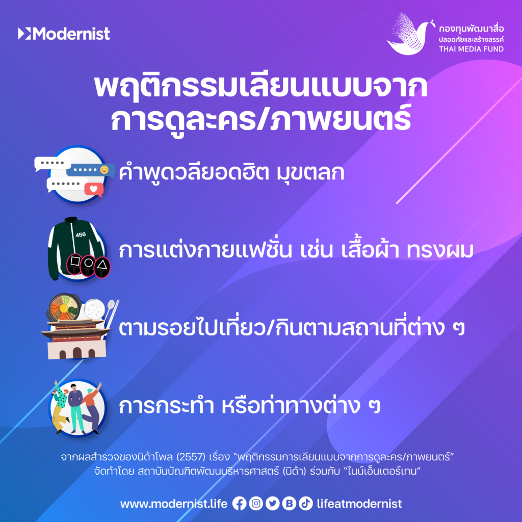เมื่อย้อนดูตัวเองแล้ววิเคราะห์ ก็พบผลสำรวจของนิด้าโพล (2557) เรื่อง “พฤติกรรมการเลียนแบบจากการดูละคร/ภาพยนตร์” จัดทำโดย สถาบันบัณฑิตพัฒนบริหารศาสตร์ (นิด้า) ร่วมกับ “ไนน์เอ็นเตอร์เทน” พบการศึกษาพบว่า ผู้ชมละคร/ภาพยนตร์ส่วนใหญ่มีพฤติกรรมเลียนแบบ คำพูดวลียอดฮิต มุขตลก, การแต่งกายแฟชั่น เช่น เสื้อผ้า ทรงผม, ตามรอยไปเที่ยว / กิน ตามสถานที่ต่าง ๆ และการกระทำ หรือท่าทางต่าง ๆ ตามลำดับ เห็นได้ว่าคนดูละครมักจะทำตามและเลียนแบบ