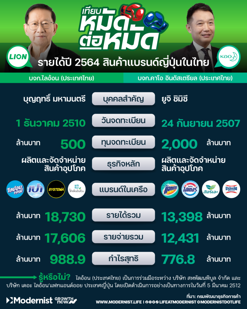 คอลัมน์ “หมัดต่อหมัด” รอบนี้ขอพาทุกคนมาสู่ดินแดนแห่งความสะอาด เชื่อว่าใครหลายคนคงต้องคุ้นเคยกับการทำงานบ้านบ้าง แม้กระทั่งทำความสะอาดร่างกาย และแน่นอนว่าหลายคนคงคุ้นแบรนด์ดังต่อไปนี้ ไม่ว่าจะเป็น ไลปอนเอฟ, เปา, ซิสเท็มมา, โชกุบุสซึ และอีกหลายแบรนด์ที่อยู่ภายใต้ ไลอ้อน (ประเทศไทย) อีกฟากหนึ่งคงไม่มีใครไม่รู้จัก แอคแทค, ไฮเตอร์, ลอรีเอะ, มาจิคลีน และอีกหลายแบรนด์เช่นกันที่อยู่ในเครือของคาโอ อินดัสเตรียล (ประเทศไทย) ซึ่งทั้งสองบริษัทต่างเป็นบริษัทญี่ปุ่นที่อยู่ในประเทศไทยมาอย่างยาวนาน วันนี้เราจะมาเทียบหมัดต่อหมัดเกี่ยวกับรายได้ที่น่าสนใจกัน