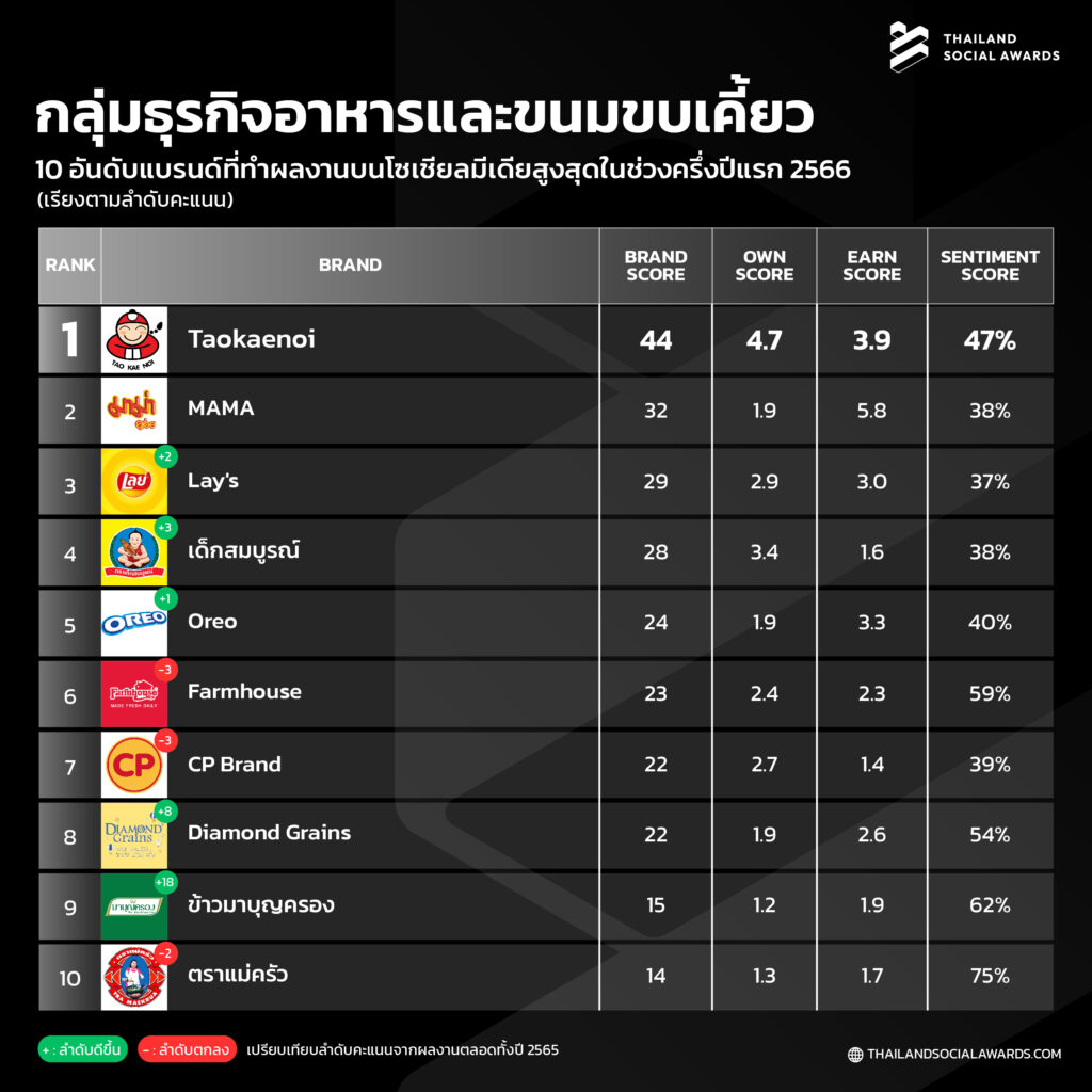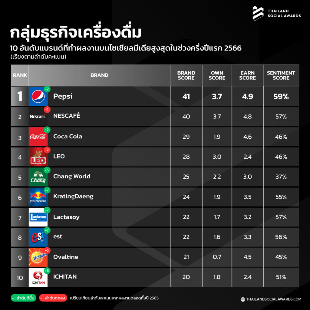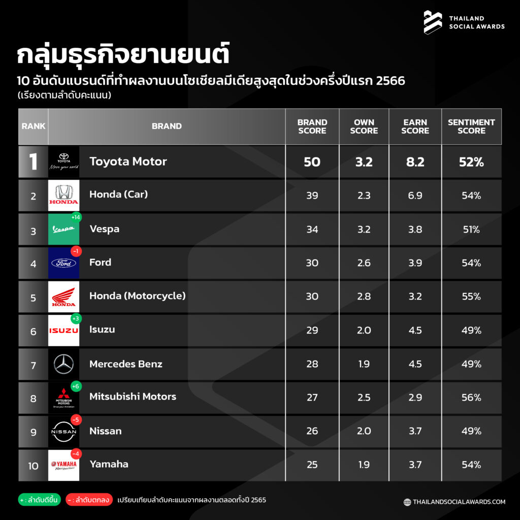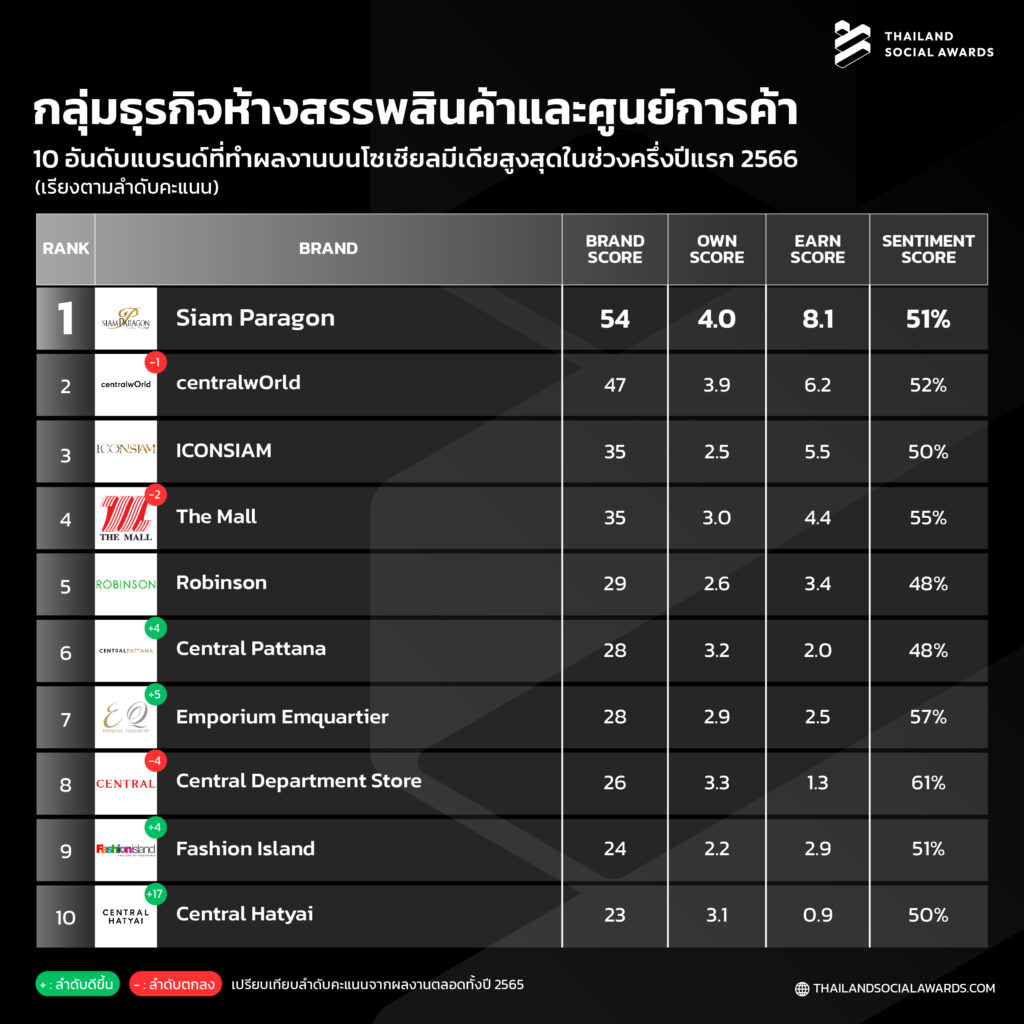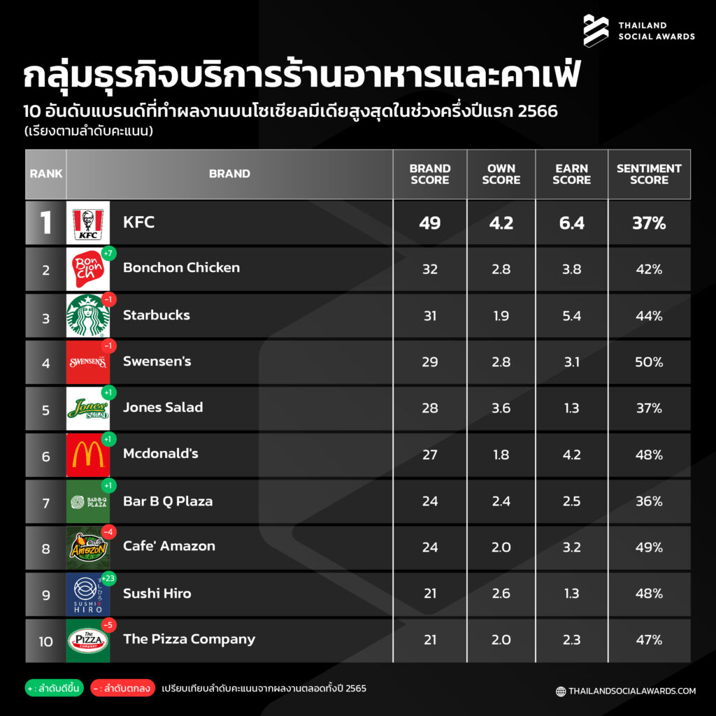 โดย 10 อันดับแบรนด์ 29 กลุ่มธุรกิจ ที่ทำผลงานสูงสุดบนโลกโซเชียลครึ่งแรกของปี 2566 (ตั้งแต่วันที่ 1 มกราคม – 30 มิถุนายน 2566) มีดังนี้