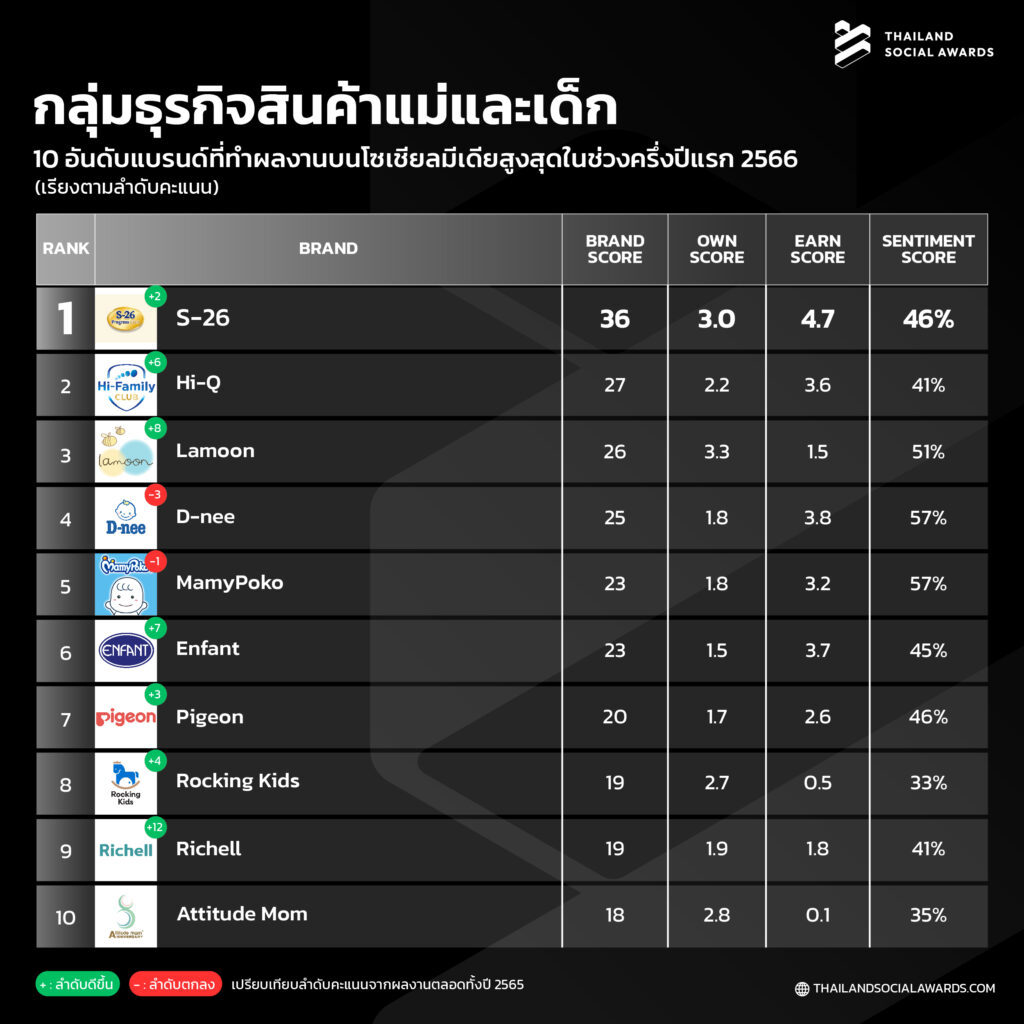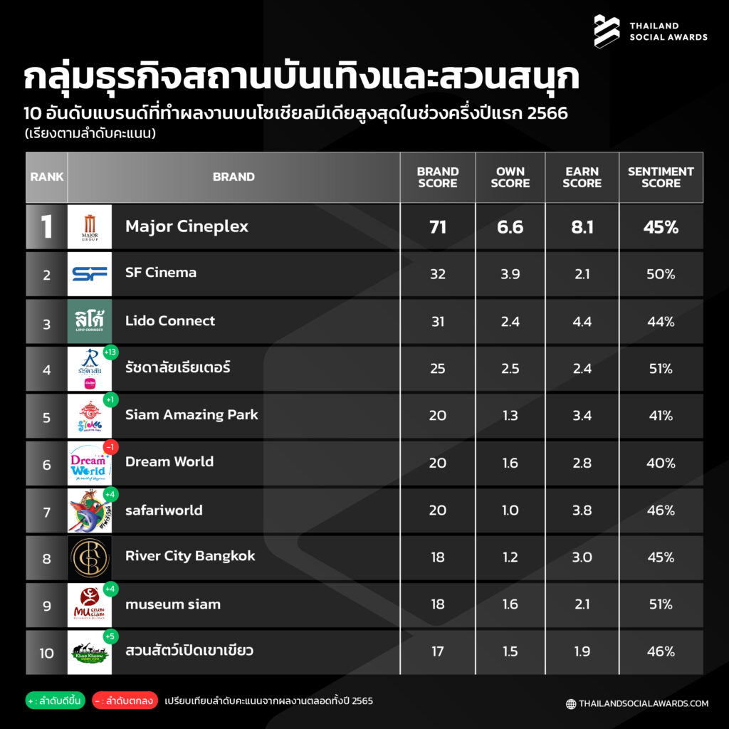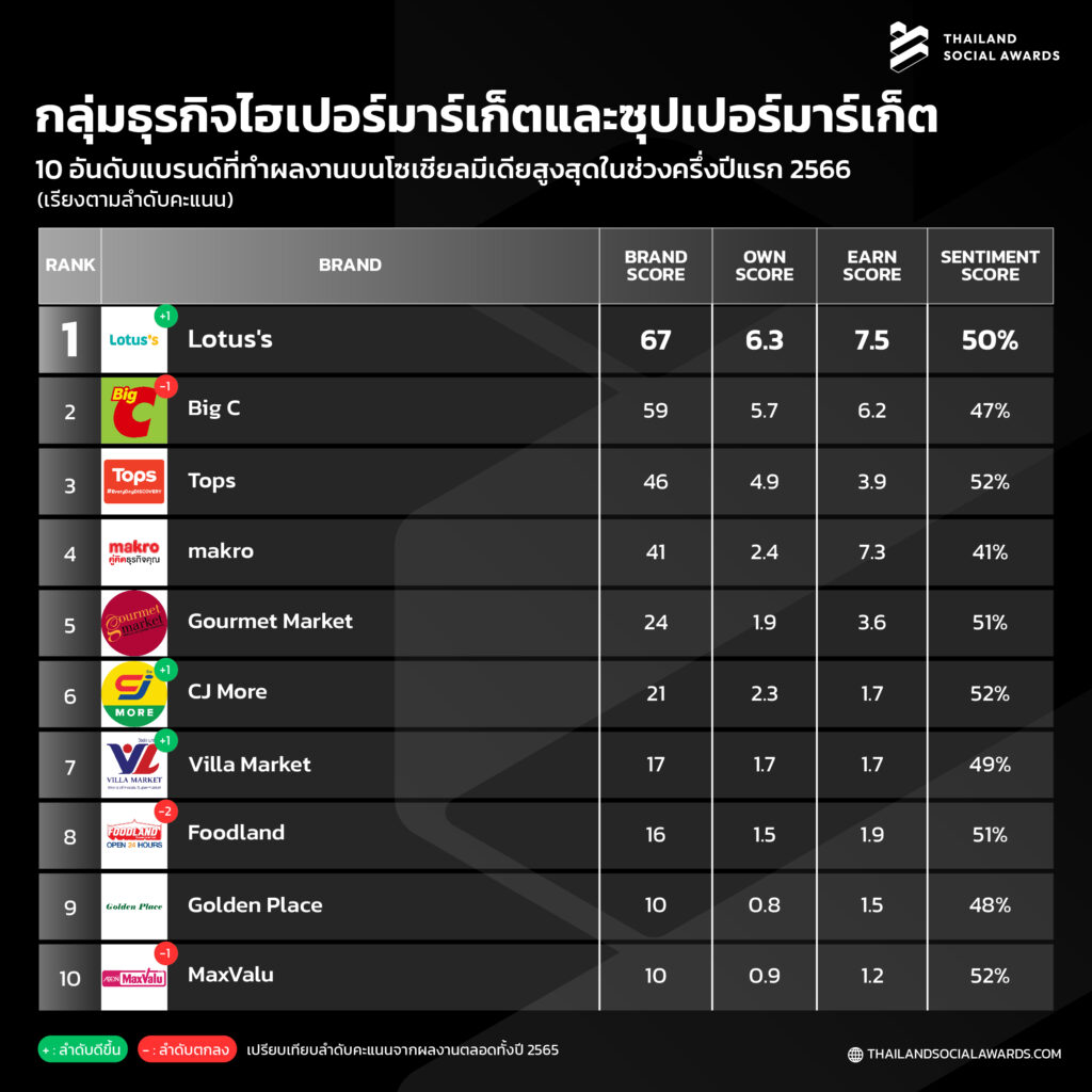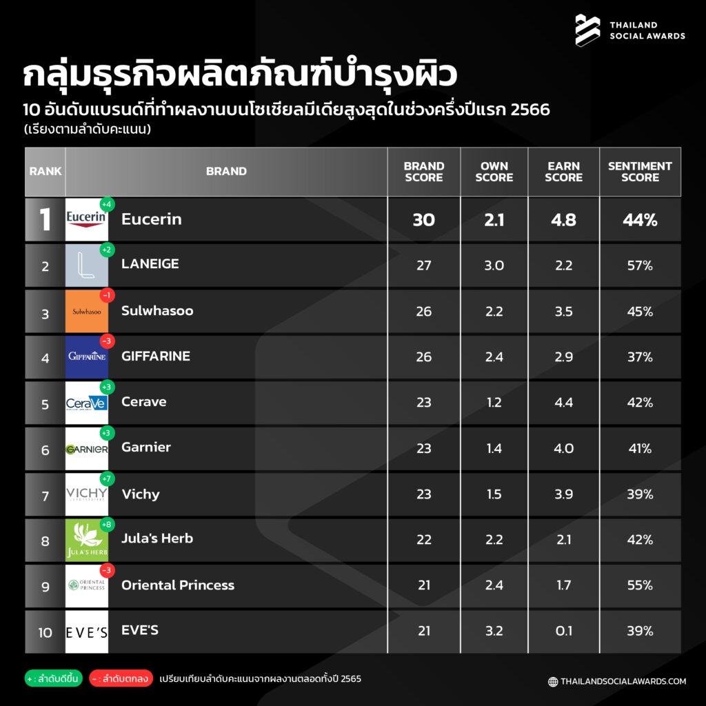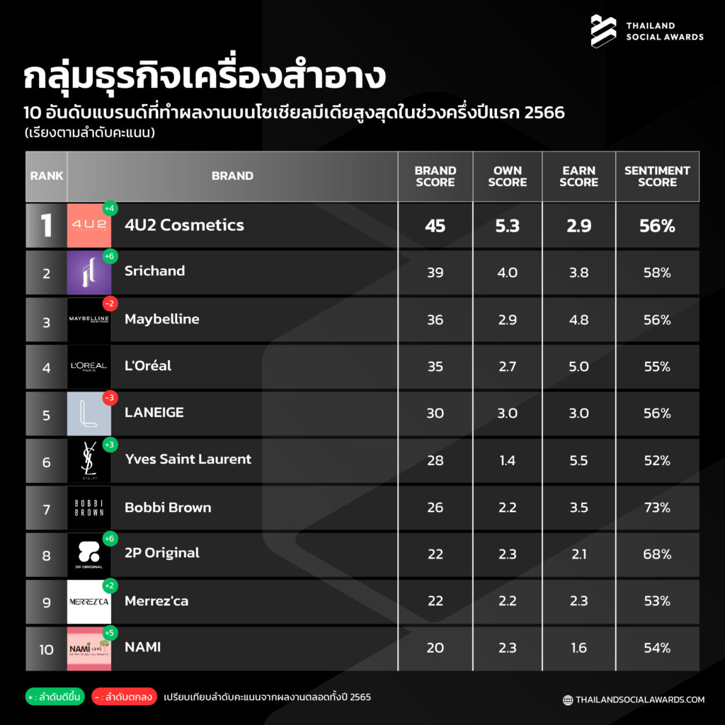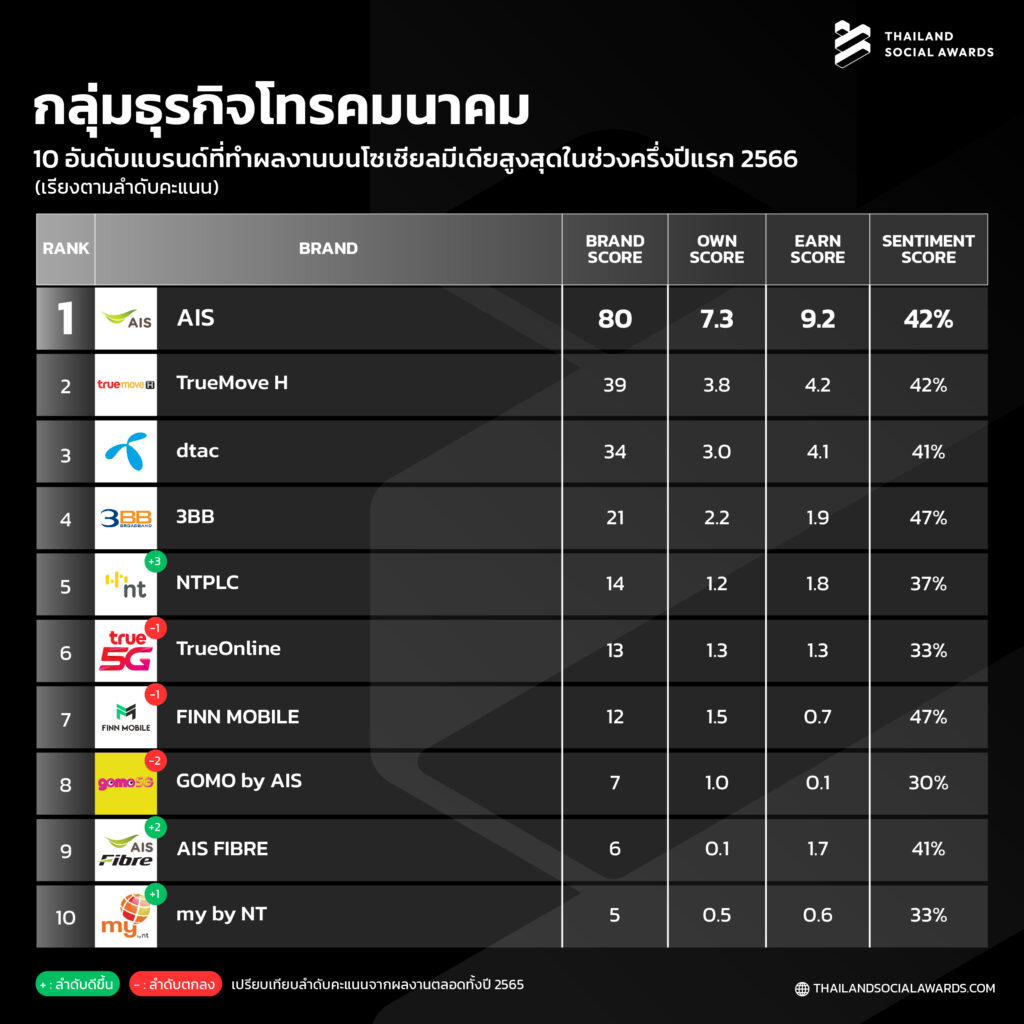 โดย 10 อันดับแบรนด์ 29 กลุ่มธุรกิจ ที่ทำผลงานสูงสุดบนโลกโซเชียลครึ่งแรกของปี 2566 (ตั้งแต่วันที่ 1 มกราคม – 30 มิถุนายน 2566) มีดังนี้