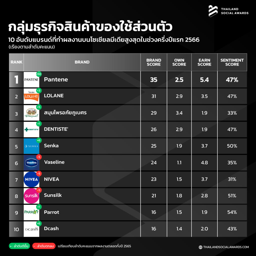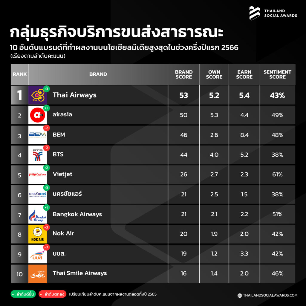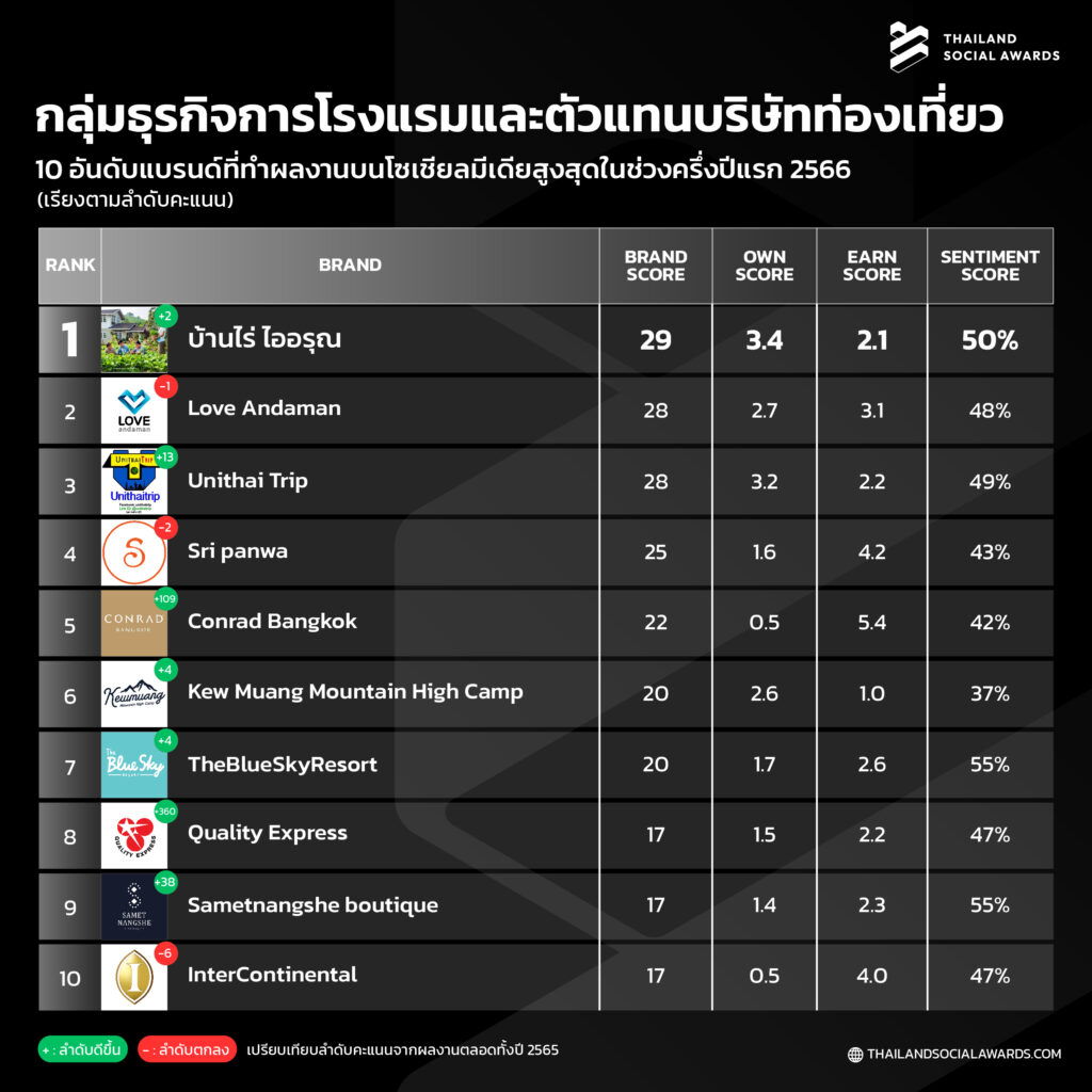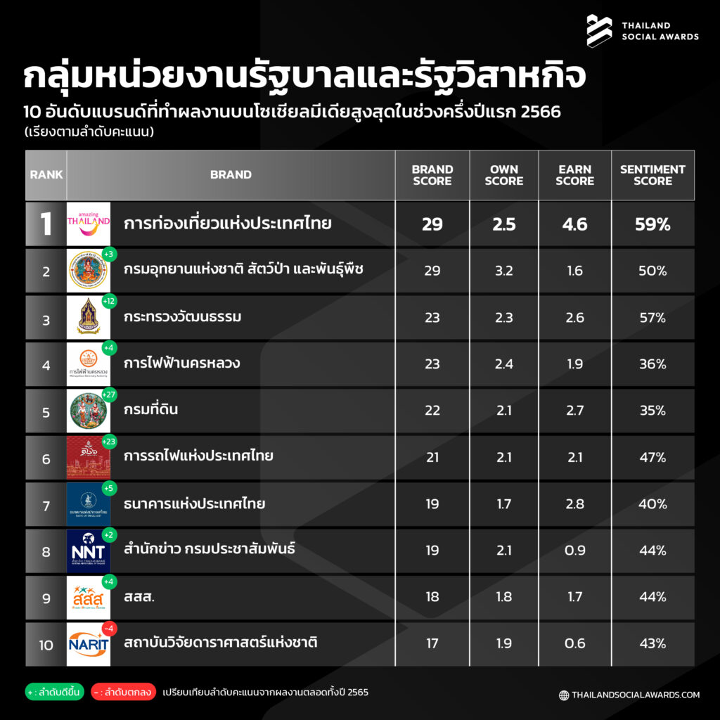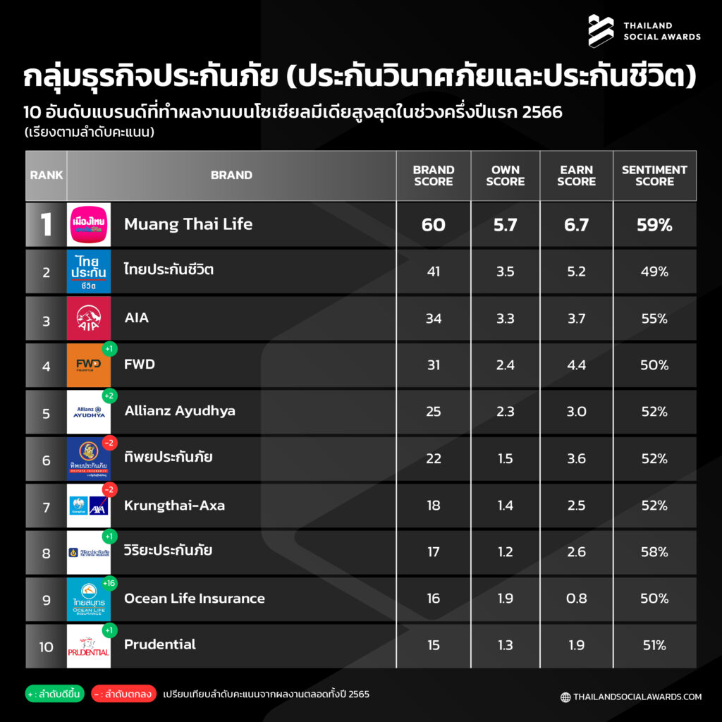 โดย 10 อันดับแบรนด์ 29 กลุ่มธุรกิจ ที่ทำผลงานสูงสุดบนโลกโซเชียลครึ่งแรกของปี 2566 (ตั้งแต่วันที่ 1 มกราคม – 30 มิถุนายน 2566) มีดังนี้