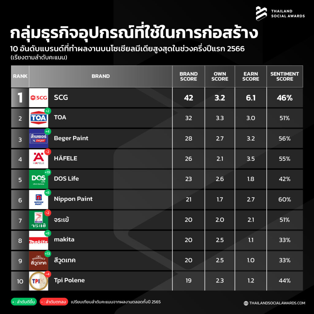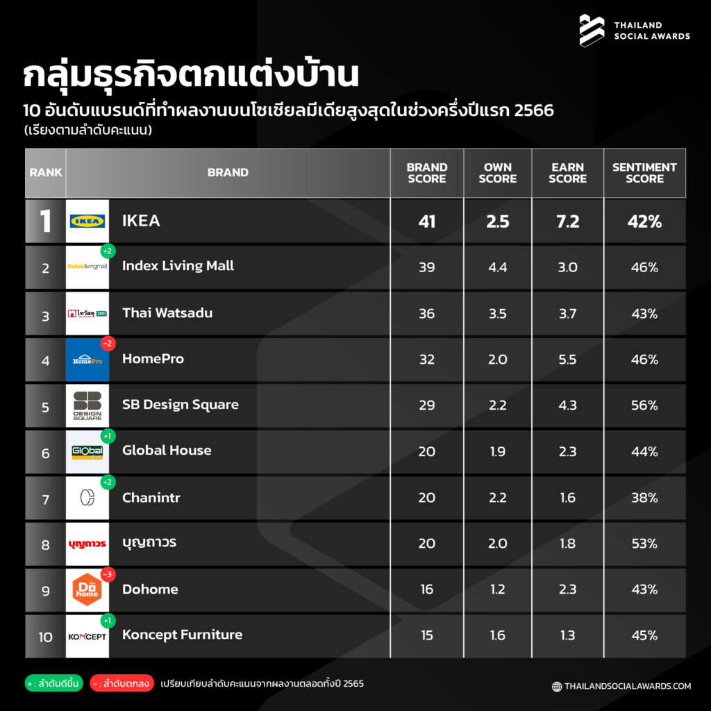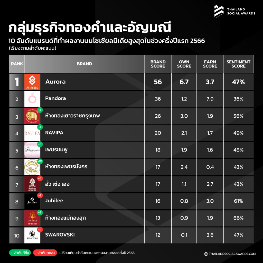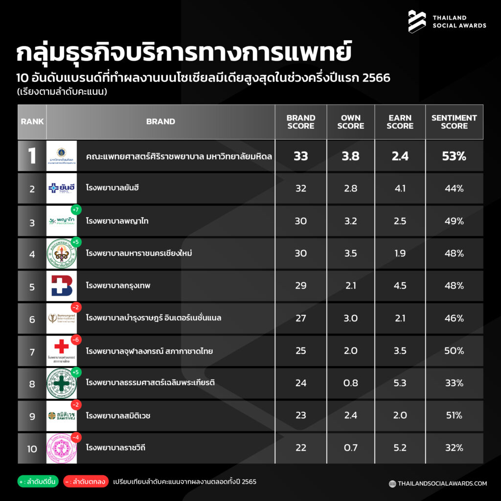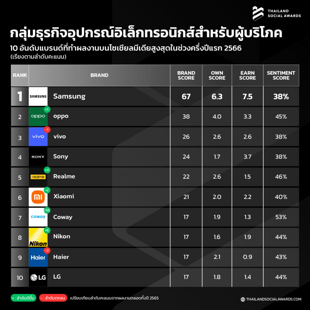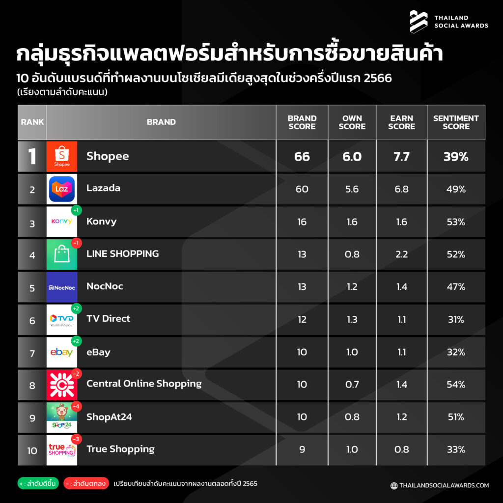 โดย 10 อันดับแบรนด์ 29 กลุ่มธุรกิจ ที่ทำผลงานสูงสุดบนโลกโซเชียลครึ่งแรกของปี 2566 (ตั้งแต่วันที่ 1 มกราคม – 30 มิถุนายน 2566) มีดังนี้