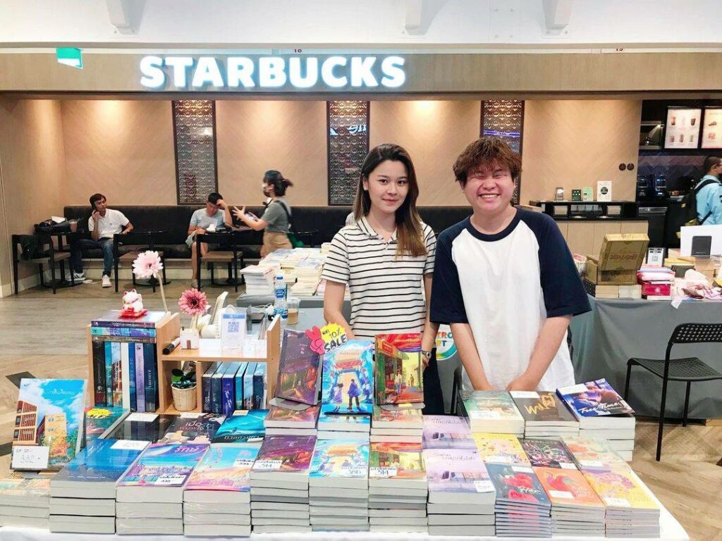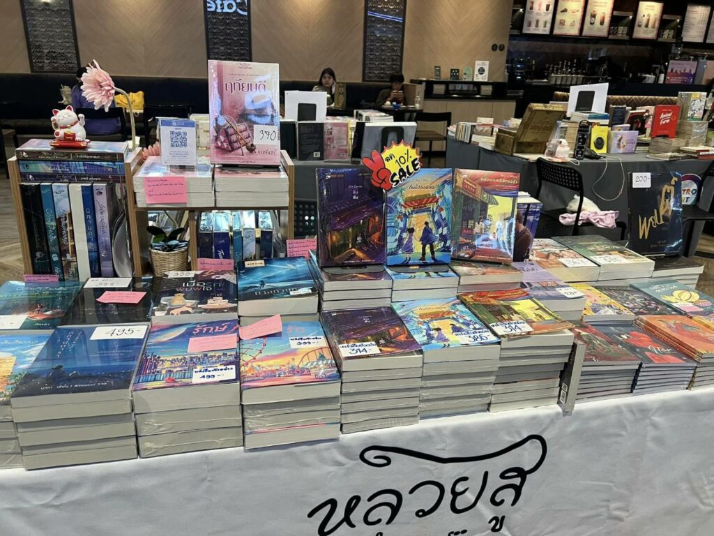 “งานสัปดาห์หนังสือช่วงเดือนมีนาคมที่ผ่านมา เราได้ลูกค้าจากหน้าร้านค่อนข้างเยอะจากบูธของหลวยสู และบาสยังใช้เทคนิคแบบป่าล้อมเมือง เรารู้จักบูธไหน เราฝากขายหมดเลย จนทำให้งานสัปดาห์หนังสือที่ผ่านมานวนิยายชุดเรือธงของสำนักพิมพ์อย่าง ‘ร้านสัมผัสรัก’ มีฝากขายทั้งหมด 15 บูธ ยอดขายถือว่าดีเลย นอกจากนี้มันทำให้คนรู้จักงานเรามากขึ้น ข้อดีของการขายหน้าร้าน หรือฝากขายตามบูธต่าง ๆ คือเราจะได้ลูกค้าขาจรที่เขาไม่ได้ตั้งใจมาซื้อ แต่เขาเห็นปกแล้วปกสวยดี ก็เลยซื้อ”