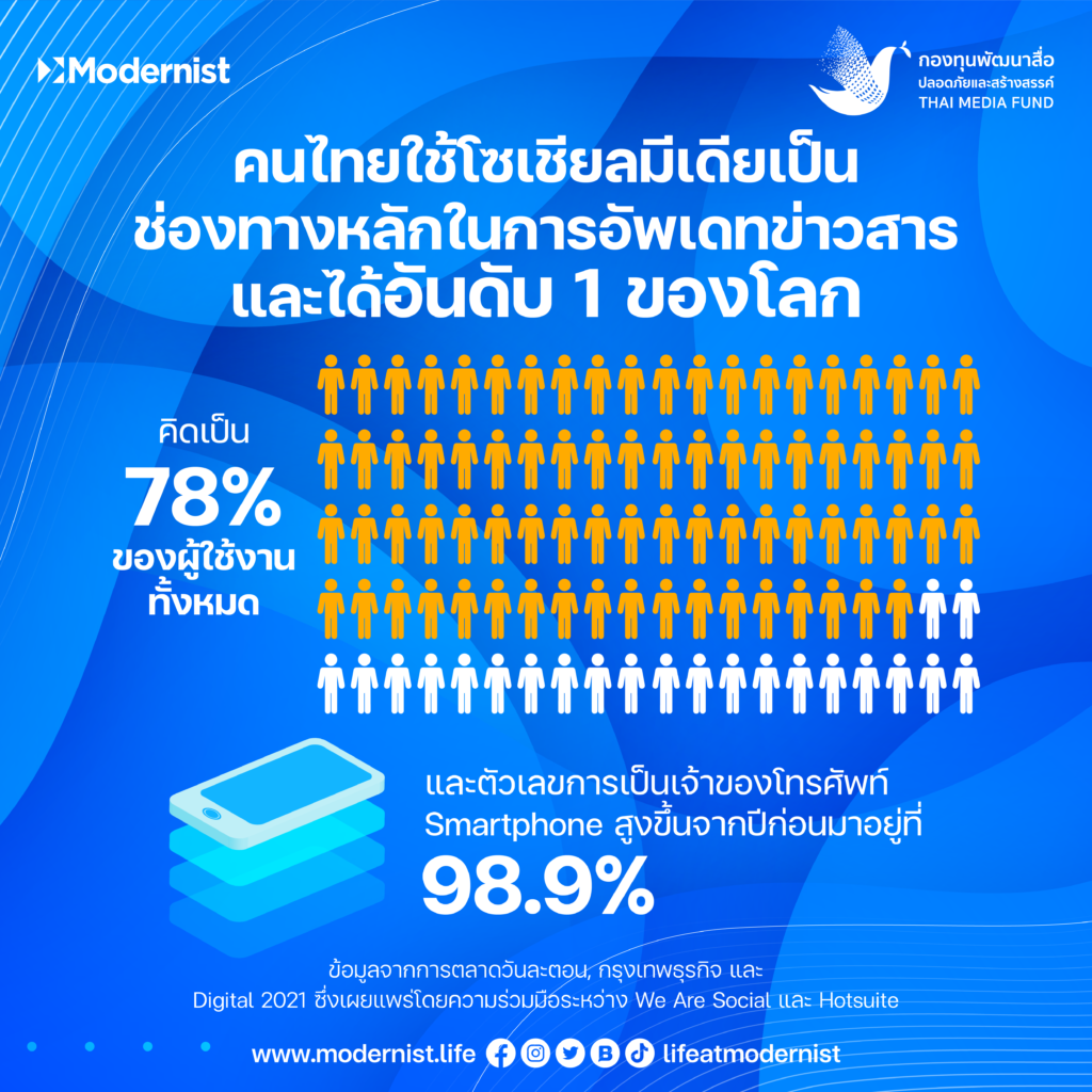 โลกของข่าวสารในปัจจุบันอยู่ในแทบจะทุกพื้นที่ของการใช้ชีวิต จากรายงาน Digital 2021 เผยแพร่โดยความร่วมมือระหว่าง We Are Social และ Hootsuite พบว่า คนไทยใช้โซเชียลมีเดียเป็นช่องทางหลักในการอัพเดทข่าวสารและได้อันดับ 1 ของโลก คิดเป็น 78% ของผู้ใช้งานทั้งหมด และตัวเลขการเป็นเจ้าของโทรศัพท์ Smartphone สูงขึ้นจากปีก่อนมาอยู่ที่ 98.9% (ข้อมูลจากการตลาดวันละตอน และกรุงเทพธุรกิจ)