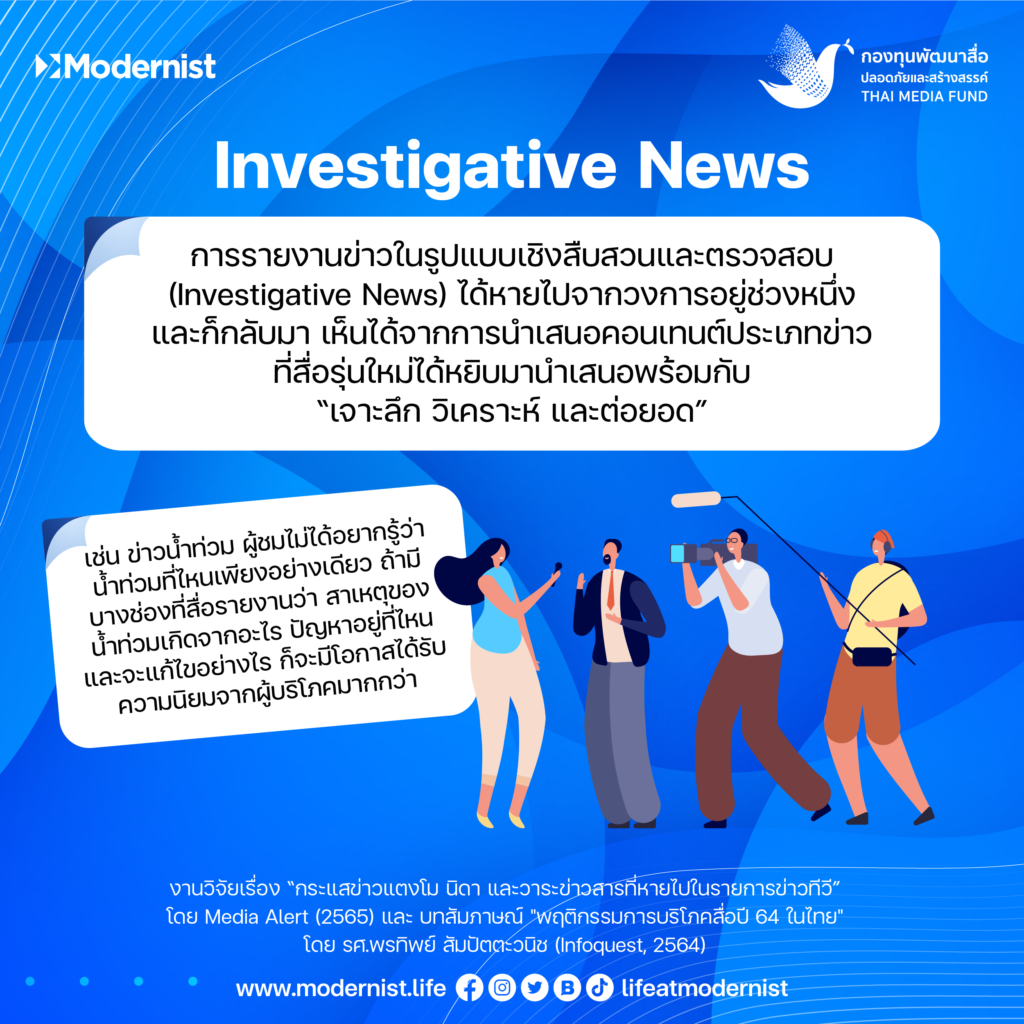 สื่อมวลชนหลายแหล่งเองนั้น ได้มีการรายงานข่าวในรูปแบบของเชิงสืบสวนและตรวจสอบ (Investigative news) ได้หายไปจากวงการอยู่ช่วงหนึ่ง และก็กลับมา ดังจะเห็นได้จากการนำเสนอคอนเทนต์ประเภทข่าวที่สื่อรุ่นใหม่ได้หยิบมานำเสนอ พร้อมกับ “เจาะลึก วิเคราะห์ และต่อยอด” ประเด็นที่ส่งผลกระทบต่อสังคมในวงกว้างหรือกำลังเป็นกระแส “อย่างข่าวน้ำท่วม ผู้ชมไม่ได้อยากรู้ว่า นํ้าท่วมที่ไหนเพียงอย่างเดียว ถ้าอย่างนั้นจะเป็นข่าวแบบ in general แต่ถ้ามีบางช่องที่รายงานว่า สาเหตุของนํ้าท่วมเกิดจากอะไร ปัญหาอยู่ที่ไหน และจะแก้ไขอย่างไร ก็จะมีโอกาสได้รับความนิยมจากผู้บริโภคมากกว่า” พรทิพย์ สัมปัตตะวนิช (2564)