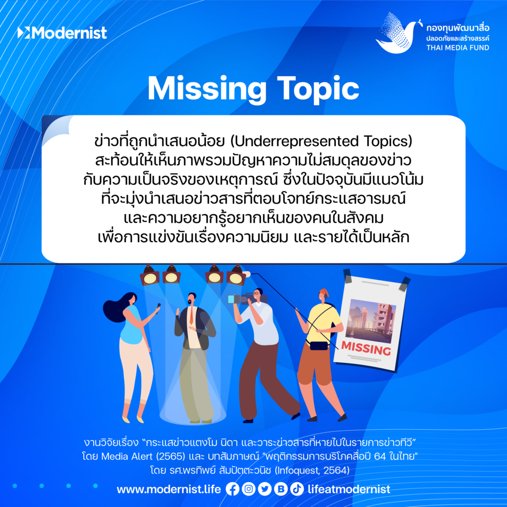 ผลการศึกษาพบ พื้นที่ข่าวที่หายไป (Missing Topics) ข่าวที่ถูกนำเสนอน้อย (Underrepresented Topics) รวมถึงพื้นที่ข่าวที่ล้นเกิน (Overrepresented Topics) ที่พบจากการเปรียบเทียบสัดส่วนประเด็นข่าวในผลการศึกษาในครั้งนี้ สะท้อนให้เห็นภาพรวมปัญหาความไม่สมดุลของวาระข่าวกับความเป็นจริงของเหตุการณ์ และการทำหน้าที่กำหนดวาระข่าว-วาระทางสังคมของข่าวโทรทัศน์ในปัจจุบัน ที่มีแนวโน้มมุ่งนำเสนอข่าวสารที่ตอบโจทย์กระแสอารมณ์และความอยากรู้อยากเห็นของคนในสังคม ทั้งนี้เพื่อการแข่งขันเรื่องความนิยมและรายได้เป็นหลัก และในขณะเดียวกันก็ใช้เหตุความจำเป็นดังกล่าวเป็นข้ออ้างในการจำกัดบทบาทหน้าที่ของตนเอง จนอาจละเลยบทบาทหน้าที่ในการนำเสนอข่าวสารที่เป็นประโยชน์ต่อสาธารณะ ควบคู่กับความรับผิดชอบในการสื่อสารรายงานเหตุการณ์และสถานการณ์ รวมทั้งความเปลี่ยนแปลงเป็นไปของสังคมและโลก เพื่อสร้างความเท่าทันให้ผู้บริโภคข่าวสาร สามารถแสดงความเห็น ตัดสินใจ และสามารถนำข้อมูลความรู้จากการรายงานของสื่อมาปรับใช้ในการดำรงชีวิต (Media Alert, 2565)
