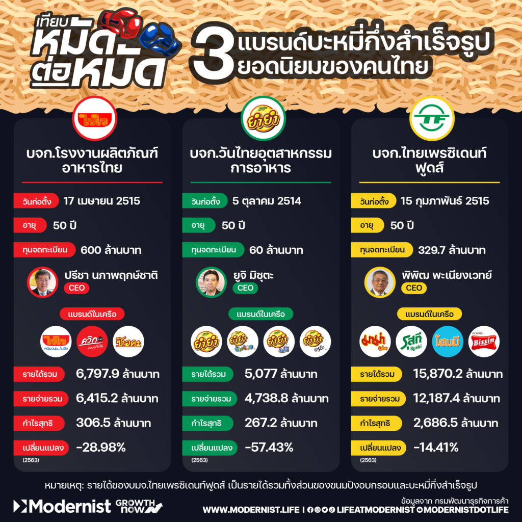 คอลัมน์ “เทียบหมัดต่อหมัด” รอบนี้ ขอพาทุกท่านไปสำรวจตลาดบะหมี่กึ่งสำเร็จรูปกันเสียหน่อย ว่าในตลาดนั้น 3 เจ้าที่ทุ่มงบไปกับการพัฒนาสินค้า รวมถึงการตลาดและเป็นที่รู้จักโดยทั่วไป ไม่ว่าจะเป็น มาม่า, ไวไว หรือยำยำ เขากอบโกยรายได้กันไปเท่าไหร่แล้วบ้างในปี 2564 ซึ่งถึงแม้จะยังเจอกับวิกฤตโควิด-19 จนทำให้กำไรสุทธิของบะหมี่กึ่งสำเร็จรูปทุกเจ้าจะลดลงก็ตาม แต่ยังรักษาฐานลูกค้าของตนเองได้ดีเลยทีเดียว