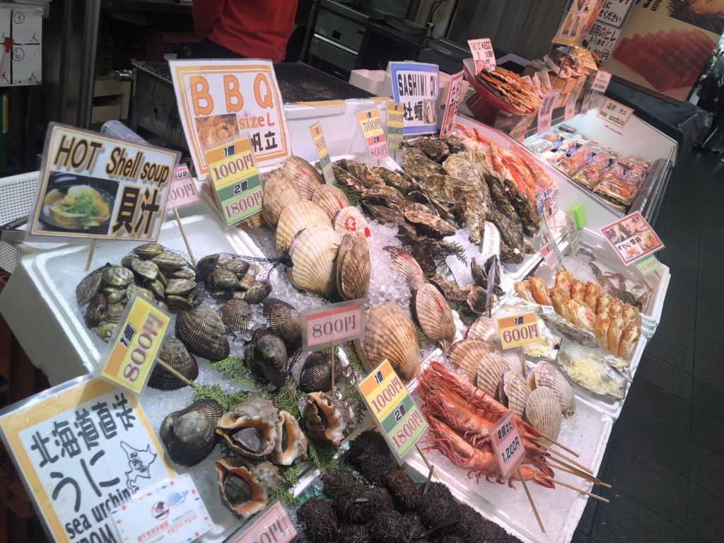 ตลาด Kuromon นั้นจะเต็มไปด้วยร้านขายอาหารทะเลแบบสดๆ เรียงรายเป็นสิบๆ ร้าน ซึ่งเป็นที่นิยมในหมู่นักท่องเที่ยวเป็นอย่างมาก เราสามารถดูได้เลยว่าเราอยากกินร้านไหน จะมีราคาแปะไว้อยู่ข้างหน้าเลย และบางร้านจะมีภาษาอังกฤษอยู่ด้วย แต่ละร้านก็จะให้บริการที่แตกต่างกัน บางร้านจะมีแบบยืนกินที่หน้าร้านหรือมีโต๊ะนั่งให้บริการ ส่วนอาหารก็เลือกได้ว่าจะกินแบบดิบหรือปรุงสุก สำหรับร้านที่มีโต๊ะนั่งก็มีบริการพิเศษอีก บางร้านหากเราทานในร้านก็จะได้ข้าวสวยในราคาพิเศษอีก! คุ้มสุดๆ (ที่บอกว่าพิเศษนี่คือราคาถูกลงนะ ไม่ใช่พิเศษราคาเลยแพงขึ้น 5555) เอาเป็นว่าก่อนที่จะตัดสินใจเข้าร้านไหนลองเดินดูให้รอบๆ ก่อนแล้วค่อยตัดสินใจก็ยังพอมีเวลา แต่รับรองความสดของอาหาร ผมนี่ยกนิ้ว “โป้ง” ให้เลย