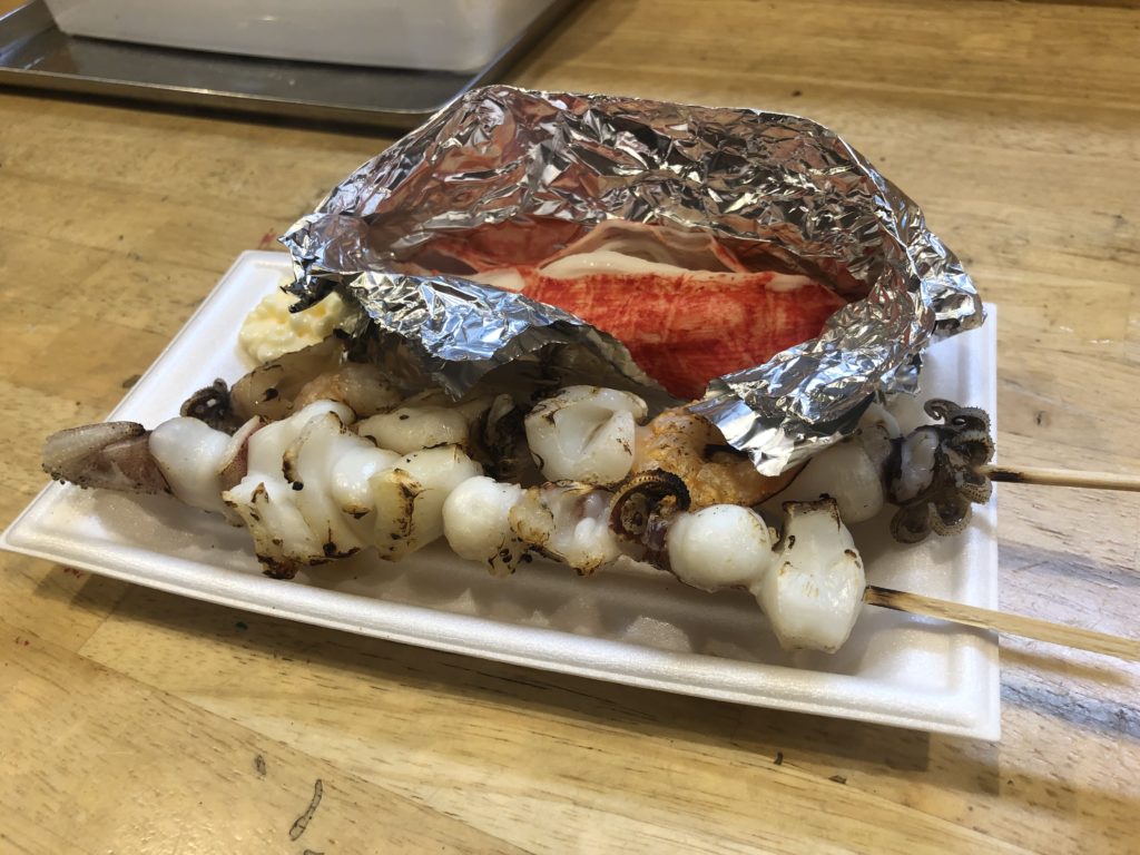 สำหรับผมมื้อเช้าขอเบาๆ เป็นหมึกย่างและปูร้อนๆ กินกับข้าวสวยอุ่นฟินๆ และหอยย่างสักตัวสองตัว ถ้ากินเอาอิ่มจริงๆ คงหมดตัว ล้มละลายจนไม่สามารถกินอย่างอื่นได้อีกต่อไป หากไม่อิ่มแถวนั้นก็ยังมีของกินอื่นๆ ทั้งซอฟต์ครีม ของหวานต่างๆ รวมถึงซุปเปอร์มาร์เก็ต และที่สำคัญขายทุเรียนจากไทยด้วยนะ (ลูกละประมาณ 5,000 – 7,000 เยน หรือคิดเป็นเงินไทย ประมาณ 1,450 บาท)