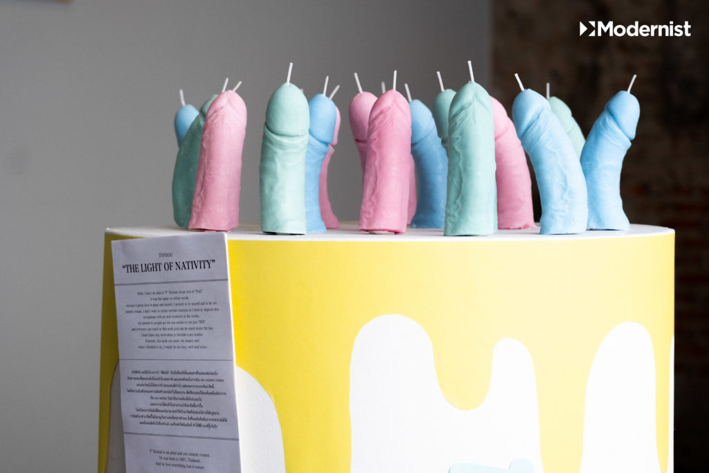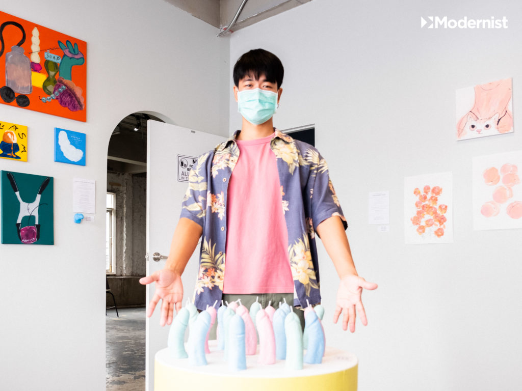 “งานศิลปะส่วนใหญ่ มันมักจะพูดถึงเรื่อง Sexual ด้วยความตรงไปตรงมา แต่เรารู้สึกว่า แต่เราไม่ได้เป็นคนที่ Come Out เรื่อง Sex ขนาดนั้น เราเลยใช้ Symbolic (สัญลักษณ์) จากของที่มีอยู่ในชีวิตประจำวันเอามาเล่า และให้คนที่มาดูตีความตามประสบการณ์ของเขา”