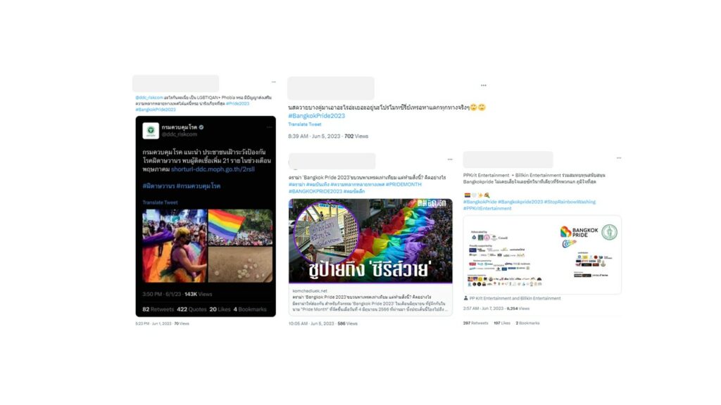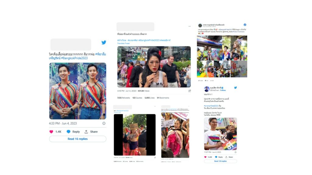 อีกทั้งข้อความส่วนใหญ่จะเกิดขึ้นบน Facebook มากที่สุด (39%) ตามมาด้วย Twitter (35%) Instagram (19%) และอื่นๆ (7%) ส่วนใหญ่เป็นการโพสต์รูปภาพงานเดินขบวนพาเหรดผ่านแฮชแท็ก #BangkokPride2023 และ #บางกอกไพรด์2023 ทั้งจากเหล่าคนดัง ดารา นักร้อง นักแสดงต่างๆ นอกจากนี้ ยังมีกระแสของการพูดถึง #สมรสเท่าเทียม ที่ถูกพูดถึงตั้งแต่ปีที่ผ่านมา จากการที่คุณพิธา ลิ้มเจริญรัตน์ ซึ่งผลักดันเรื่องการสมรสเท่าเทียม ก็มาร่วมเดินขบวนพาเหรดและมีการพูดถึงเรื่องนี้อีกครั้ง ยิ่งทำให้มีกระแสการพูดถึงในวงกว้างมากขึ้น สร้างการรับรู้และความเข้าใจในเรื่องความหลากหลายทางเพศมากขึ้น