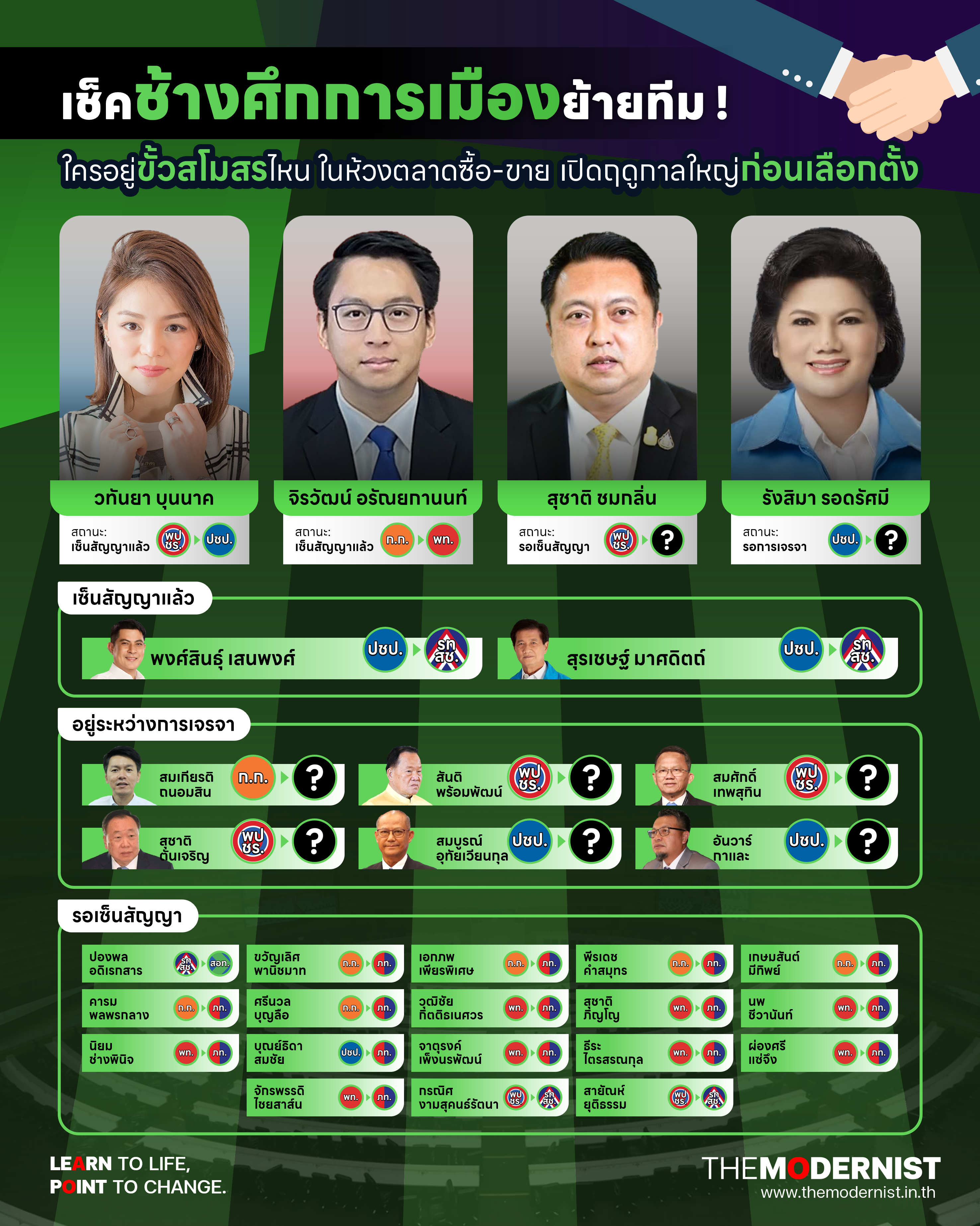วันนี้ THE MODERNIST จะพามาสำรวจตลาดซื้อขายนักเตะช้างศึกการเมืองไทยในรอบ 3 เดือนที่ผ่านมา ที่เรามี OPINION ว่าการโยกย้ายพรรคของนักการเมือง ช่างเสมือนนักเตะที่ย้ายทีมฟุตบอลอย่างไรอย่างนั้น ซึ่งมีทั้งสิ่งที่สะท้อนออกมาว่านักการเมืองพร้อมจะย้ายไปพรรคอื่น หรือที่เราเรียกว่า “เซ็นสัญญาแล้ว” หรืออีกด้านที่ยังไม่มีความแน่ชัด มีแต่ข่าวลือสะพัด ที่เราเรียกว่า “อยู่ระหว่างการเจรจา” และก็อีกฟากหนึ่งที่ไปค้าแข้งให้สโมสรอื่น แต่ชื่ออยู่อีกทีมเราเรียกว่า “รอเซ็นสัญญา”