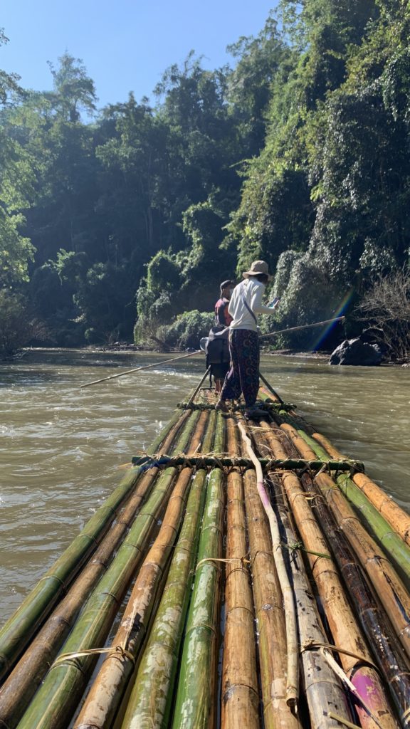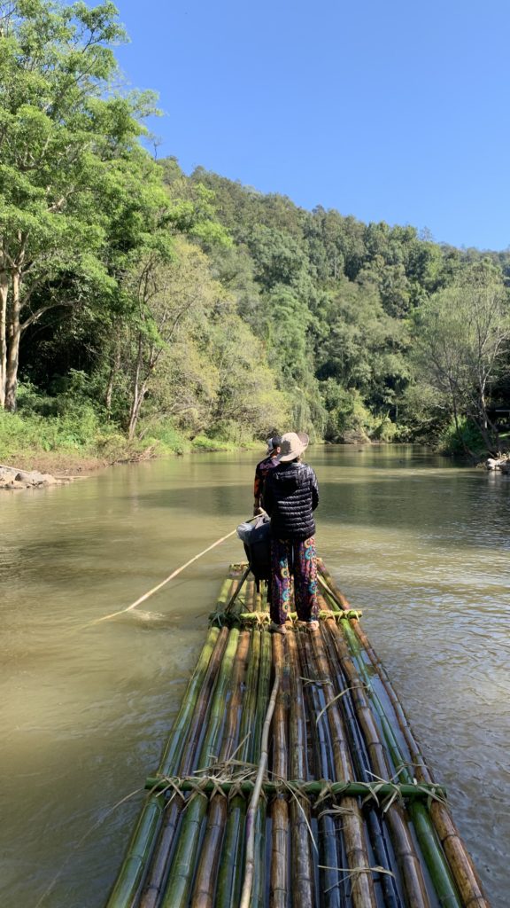 ยังดีที่ผมไปช่วงหน้าหนาว น้ำในแม่น้ำแม่แตงไม่ลึกมาก บางช่วงเราก็กระโดดไปเล่นน้ำได้ แต่ถ้ามาช่วงหน้าฝน ไกด์บอกผมว่า น้ำลึกจนไม้ไผ่ที่เอาไว้ค้ำถ่อแพ ปักไปไม่ถึงก้นแม่น้ำ…