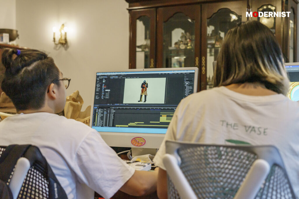 เอม: เราก็เอามาคุยกับน่อมว่าเราจะทำเป็นภาพยังไง แล้วเราก็มาดูว่าจะใช้สไตล์ไหนดี แต่ว่าสุดท้ายน่อมก็จะเป็นคนวาดมันออกมาแล้วกระจายไฟล์ให้แชมป์กับเรา พอกระจายไฟล์ไปก็จะเป็นหน้าที่ของแต่ละคน เรามีอีกหน้าที่หนึ่งคือตัดพาร์ทว่าใครจะทำตรงไหนบ้าง สมมติว่าได้เสียงมาเราก็จะเป็นคนตัดว่าโอเคพาร์ทนี้น่อมทำนะ เราทำนะ แชมป์ทำนะ แล้วก็เป็นคนตรวจซับด้วย คือเอาบทที่ใส่เรียงกันเยอะ ๆ มาทำเป็นซับ