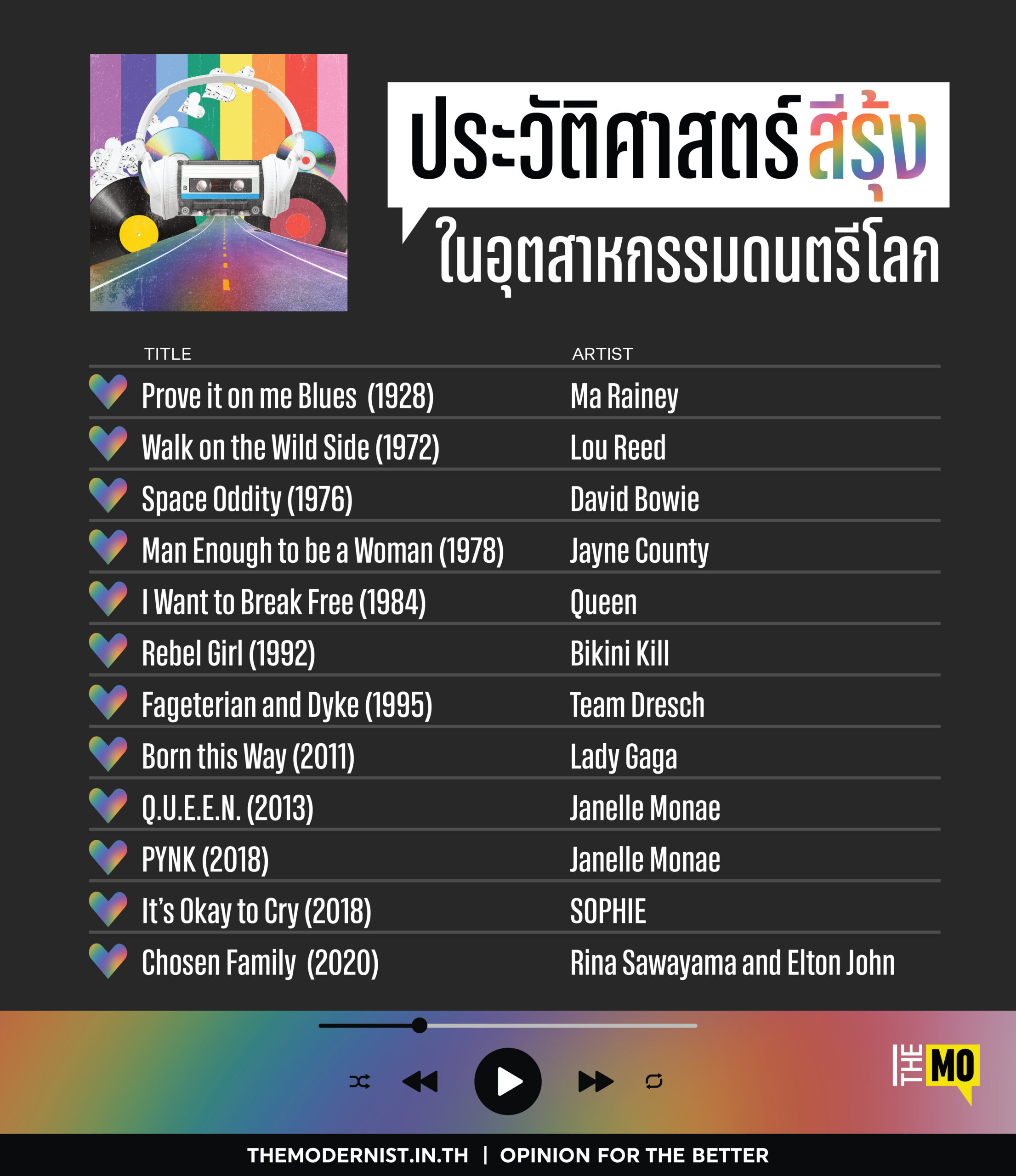 สำหรับชุมชน LGBTQ+ ดนตรีเป็นเครื่องมือคู่ใจที่พวกเขาใช้สื่อสารอัตลักษณ์ของตัวเอง รวมถึงความรู้สึกนึกคิด ความกังวล และความโกรธเกรี้ยวที่มีต่อบรรทัดฐานของสังคม ผ่านเนื้อเพลงและท่วงทำนองมาอย่างยาวนาน จนกระทั่งปัจจุบันที่อินเทอร์เน็ตกลายเป็นช่องทางการสื่อสารขนาดใหญ่ ก็ยิ่งสร้างพื้นที่ให้กับ LGBTQ+ ในอุตสาหกรรมดนตรีมากขึ้น