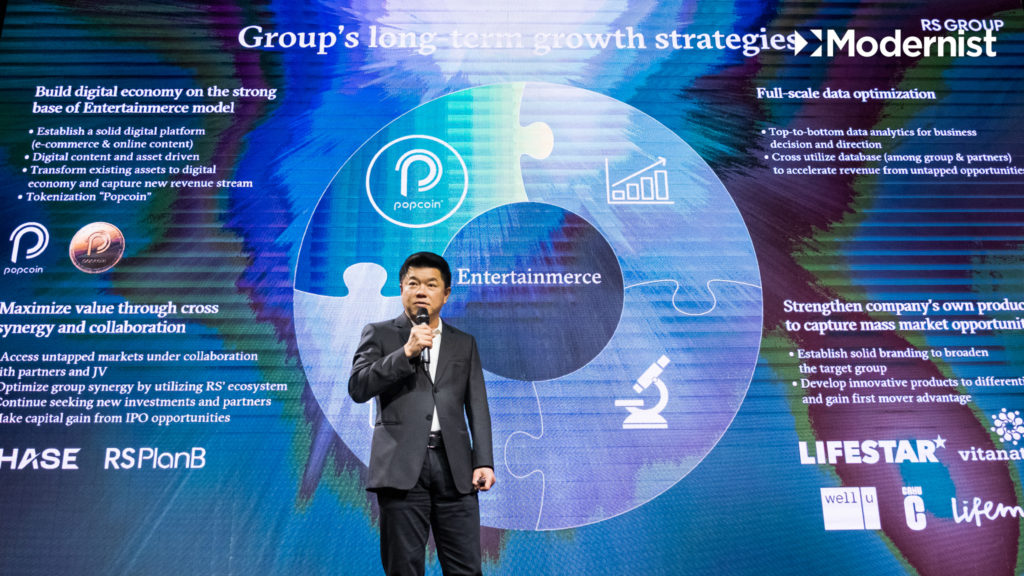 อาร์เอส กรุ๊ป ในปี 2022 มาพร้อมกับแนวคิด Rising for Sustainable Growth เป็นปีที่จะเก็บเกี่ยวและเติบโตอย่างมั่นคงและยั่งยืน โดยได้แสดงจุดยืนว่า Popcoin ที่เป็น สมาร์ท มาร์เก็ตติ้ง แพลตฟอร์ม เป็นตัวกลางในการใช้งานต่างๆช่วยให้ผู้บริโภค แบรนด์ และผู้สร้างสรรค์คอนเทนต์มาพบเจอกัน เป็นอาวุธสำคัญที่จะเชื่อมโยงธุรกิจและลูกค้าเข้าด้วยกันอย่างไร้รอยต่อ เพื่อขยายฐานลูกค้า ซึ่ง Popcoin จะอยู่ฐานะ Infrastructure เพื่อยกระดับโมเดล Entertainmerce ให้แข็งแกร่งขึ้นในหลากหลายมิติ ทั้งการสร้าง Seamless Customer Experience และการมี Seamless Big Data พร้อมเผย 4 กลยุทธ์หลักในการสร้างการเติบโตของอาร์เอส กรุ๊ป ที่ใช้เทคโนโลยีบล็อกเชนเป็นตัวขับเคลื่อน สู่เป้าหมายรายได้ 5.1 พันล้านบาทในปีนี้