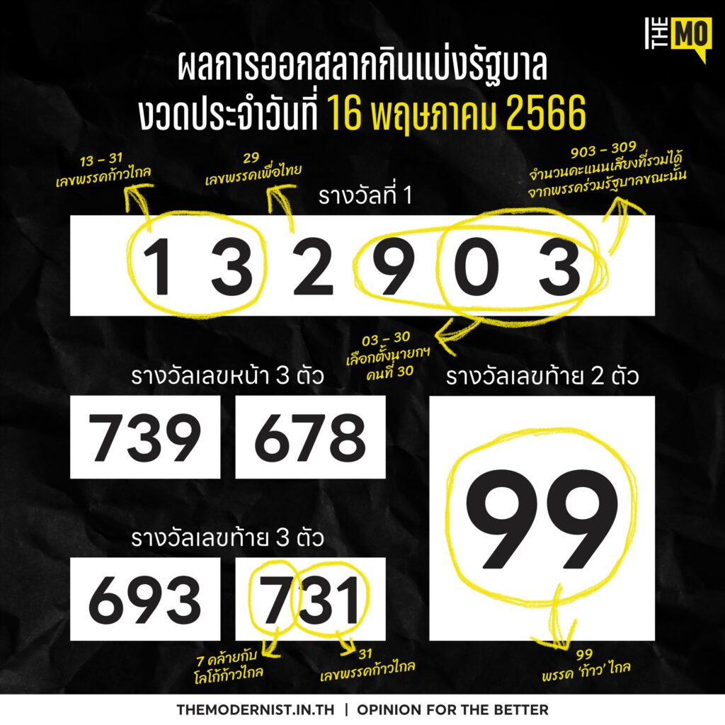 ไล่เรียงจากรางวัลที่ 1 อย่าง 132903 ที่ลงล็อกทุกตัวเลขทั้ง ‘13’ เลขกลับจาก ‘31’ หมายเลขประจำพรรคก้าวไกล, ‘29’ หมายเลขประจำพรรคเพื่อไทย และ ‘03’ เลขกลับจาก ‘30’ ที่หมายถึงการเลือกตั้งเพื่อหานายกรัฐมนตรีคนที่ ‘30’ ของประเทศไทย