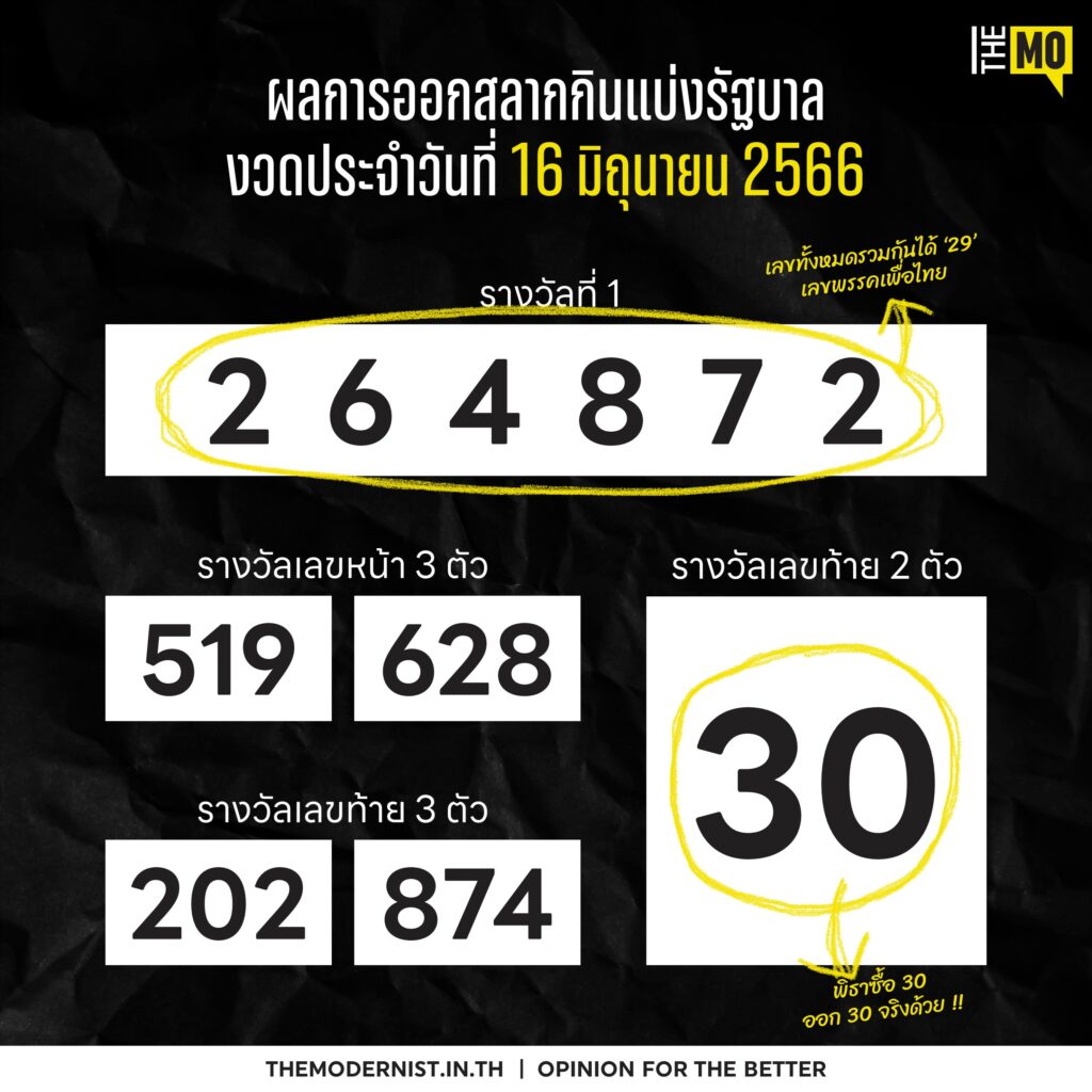 หรือรางวัลที่ 1 อย่าง 264872 ที่หากเอาเลขทั้งหมดมารวมกัน ก็บังเอิญเป็นเลข ‘29’ ตรงกับเลขพรรคเพื่อไทยอีกพอดี
