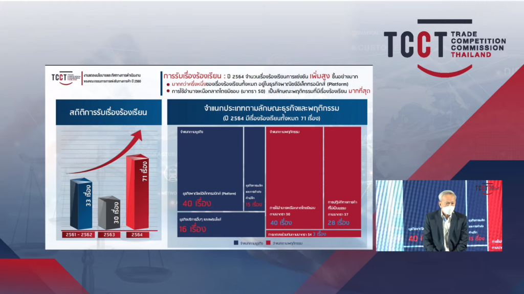 การรับเรื่องร้องเรียนปี 2564 จำนวนเรื่องร้องเรียนการแข่งขันเพิ่มสูงขึ้นอย่างมากถึง 71 เรื่อง มากกว่า 2 เท่าในปี 2563 โดยมากกว่าครึ่งหนึ่งของเรื่องร้องเรียนทั้งหมด อยู่ในธุรกิจพาณิชย์อิเล็กทรอนิกส์ (Platform) และการใช้อำนาจเหนือตลาดโตยมิชอบ (มาตรา 50) เป็นลักษณะพฤติกรรมที่มีเรื่องร้องเรียนมากที่สุด