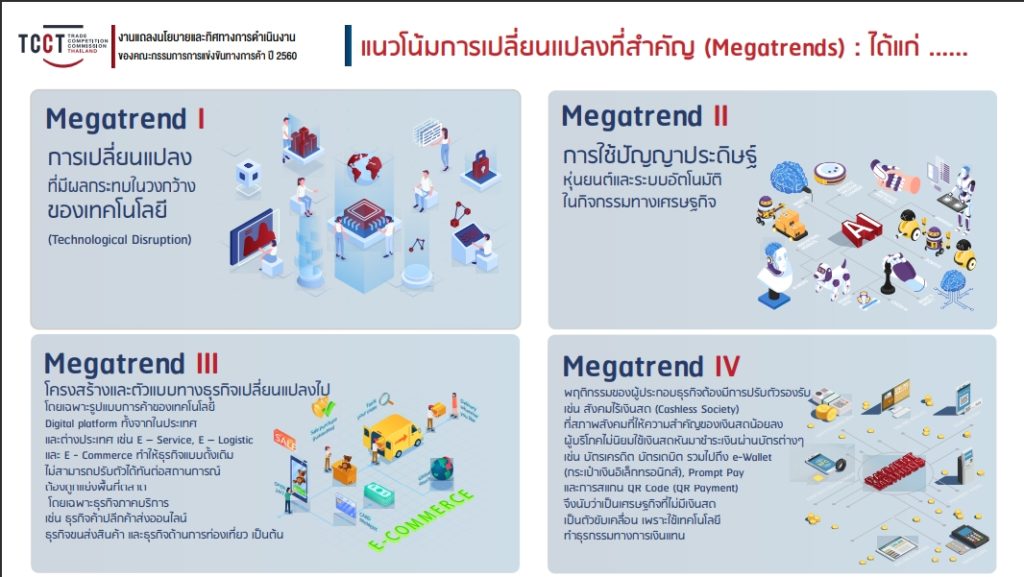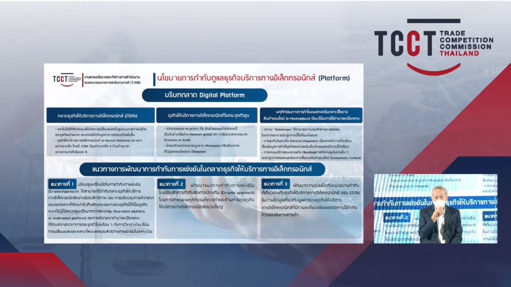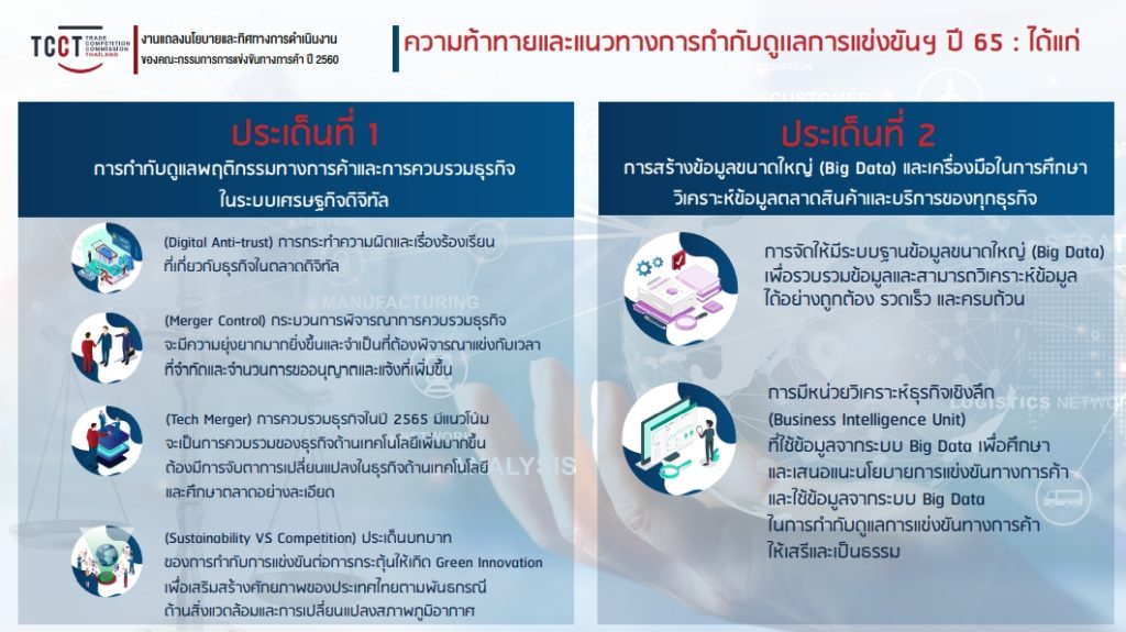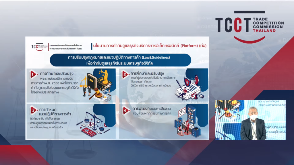 1) การกำกับดูแลการแข่งขันในธุรกิจพาณิชย์อิเล็กทรอนิกส์ (Platform) ทุกรูปแบบ ซึ่งมีการขยายตัวอย่างรวดเร็ว เนื่องจากสามารถให้บริการลูกค้าได้อย่างมีประสิทธิภาพในระบบเศรษฐกิจดิจิทัลที่ผู้บริโภคไม่นิยมใช้เงินสด โดยในปี 2564 มีมูลค่าทางธุรกิจมากถึง 4 ล้านล้านบาท อาทิ การจำหน่ายสินค้าหรือบริการ (E-Market Place) การขนส่งสินค้า (E-Logistic) การให้บริการรับสั่งและจัดส่งอาหาร (Food Delivery) และธุรกิจจองโรงแรมที่พัก (OTA) ซึ่งผู้ประกอบธุรกิจส่วนใหญ่เป็นผู้ประกอบธุรกิจรายใหญ่จากต่างประเทศ