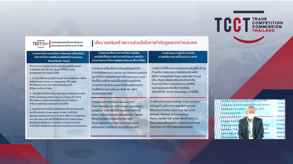 คุณกฤษฎา เปี่ยมพงศ์สานต์ กรรมการการแข่งขันทางการค้า ได้กล่าวถึงนโยบายเสริมสร้างความร่วมมือในการกำกับดูแลจากต่างประเทศ